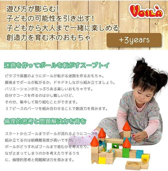 ■商品説明お城のパーツで迷路を作ってボールを転がすスロープトイ、 VOILA(ボイラ)カラフルキャッスル。3歳のお誕生日にオススメ!遊び方 ステップ1:直線の滑り台を作ってみよう。 ステップ2:カーブを組み合わせてみよう。 ステップ3:パッケージ通りのコースを作ってみよう。【対象年齢】 3歳~ 【内容】 パーツ×37、ボール3 【商品サイズ】 箱サイズ:高5.5×幅22.5×奥30cm 重量:1280g 【材質】 ゴムの木 【生産国】 タイVOILAは数々のグッドトイ賞を受賞したタイの老舗木製玩具メーカー。カラフルな色合いはもちろん、他にはないアイデアで作られた知育玩具は世界各国で絶大な人気を誇っています。ヨーロッパの安全基準のCEに合格しなめても安全な塗料を使用しています。 また天然のゴムの木でできた環境にやさしい素材を使用しています。?もっと見る