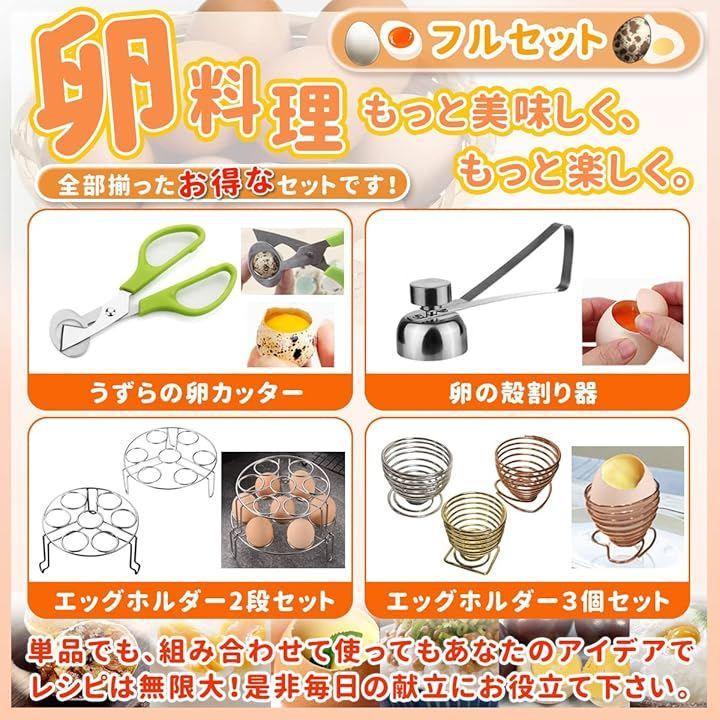 「全部そろったお得なフルセット」(1)うずらの卵カッター(2)卵の殻割り器(3)エッグホルダー2段セット(4)エッグホルダー3個セット。
