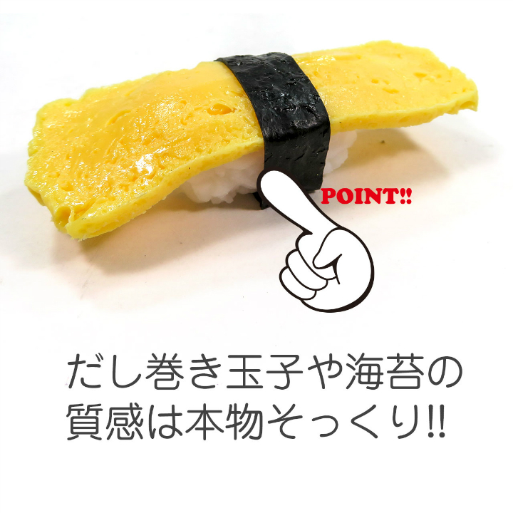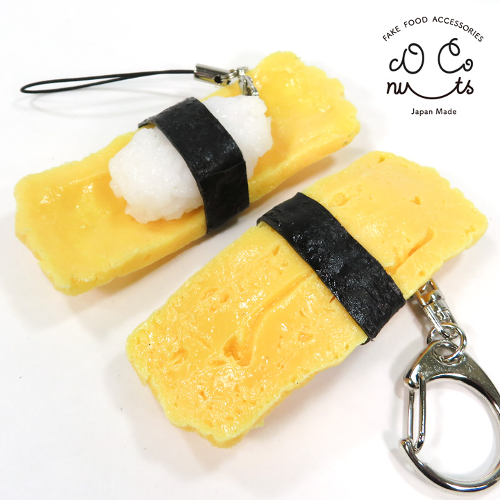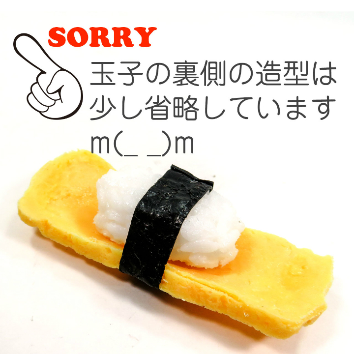 本物の玉子にぎり寿司そっくりに作られた食品サンプルのアクセサリーです。