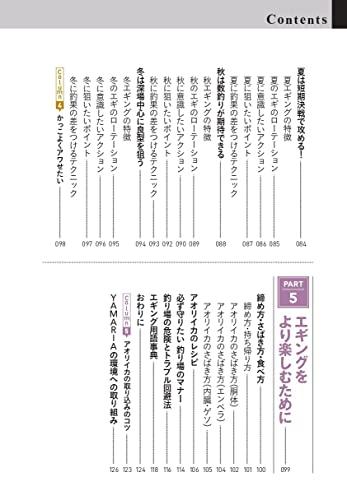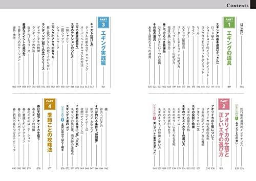 初心者にとってはエギをはじめとする道具の選び方、ラインの結び方などの準備から、キャストからランディング(取り込み)までの基本テクニックが学べ、経験者にとっては、ポイント別・時間帯別・季節別の攻略法を知ることができます。