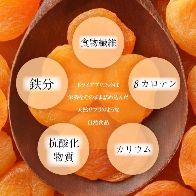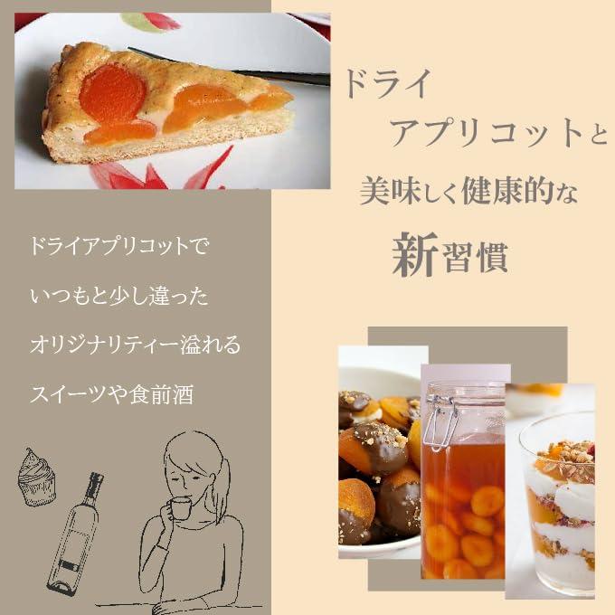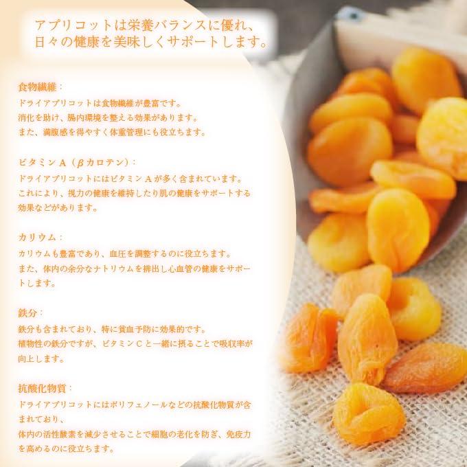 ドライあんずは水分の含有量が他のドライフルーツより多いです。必ず直射日光と高温多湿を避けて涼しい所に保管してください。開封後はなるべくお早めにお召し上がりください。内容量 450g