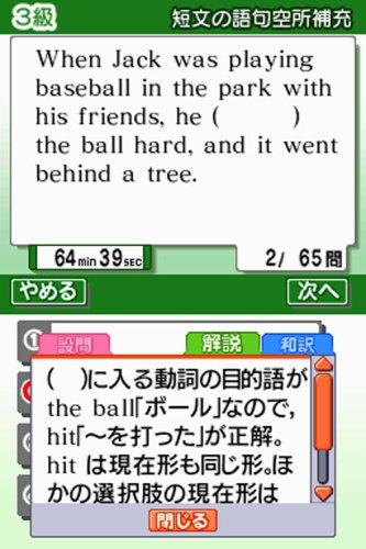商品紹介英検の過去問題を初収録!目指せ!DSで英検合格!■英検DS2のここがデラックス!【Point1】DS初の英検過去問題収録!DS英語学習ソフトで初めて、英検過去問題を収録しました。本試験と同じ出題形式で出題されるので、本番さながらのシミュレーションが可能です。また、手軽に英語力の測定ができる実力チェック機能も搭載しています。【Point2】全級全問題に詳細な解説&和訳付き!英検DS2に収録されている1級~5級全ての試験問題に、詳細な解説と和訳がついています。また、間違えた問題は記録され、あとから復習モードで挑戦できるので、学習効果もバッチリです。【Point3】書籍27冊、CD56枚分の大ボリューム!旺文社より発刊されている書籍27冊、CD56枚相当の内容を収録しています。また、選択・記述・リスニング、ディクテーションなど、様々な出題形式に対応しています。【Point4】英検対策講座収録!英検受験に必要な知識とポイントを、級、問題形式別にナビゲーターが丁寧に解説!ポイント確認→練習問