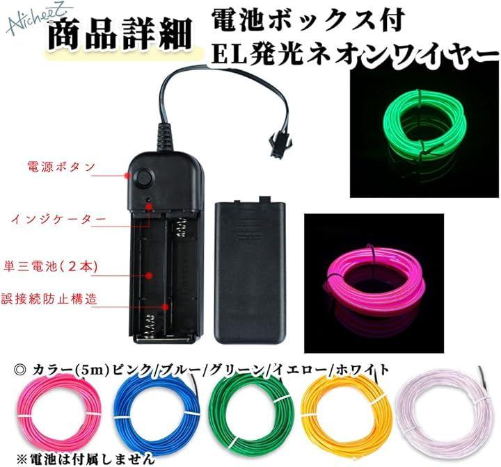 「商品内容」 電池ボックス付EL発光ネオンワイヤー カラー(5mタイプ):グリーン/ピンク/ブルー/イエロー/ホワイト (1mタイプ)イエロー+オレンジ+パープル+ブルー+ホワイト5色1セット 電池ボックス付 *電池本体は付属しません