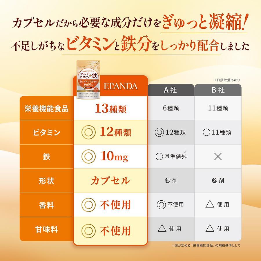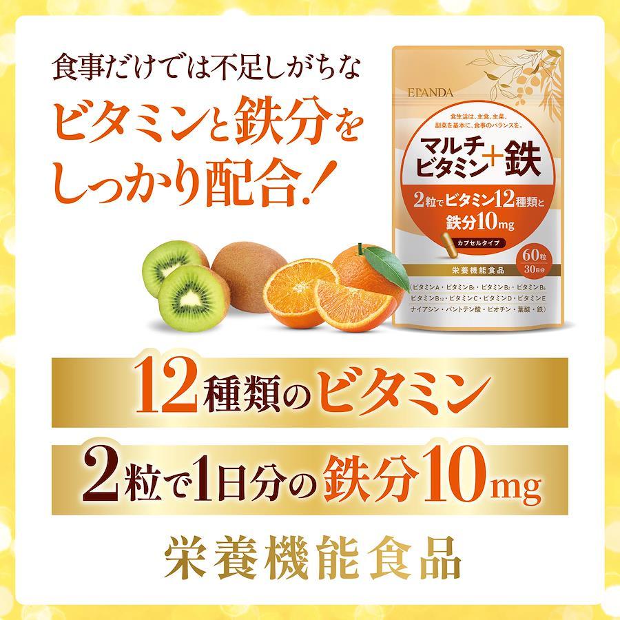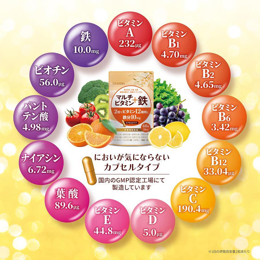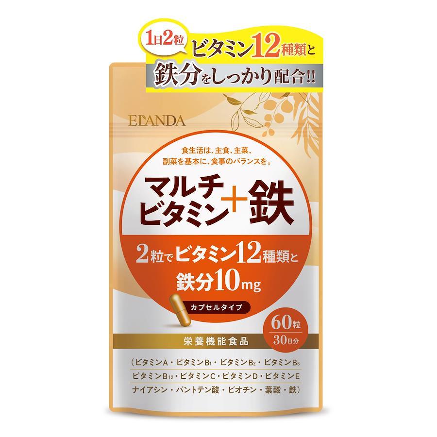 【12種類のビタミンをバランスよく配合】ビタミンK以外の主要ビタミンを幅広く含み、栄養バランスをサポート。【鉄分も同時に補える設計】特に女性に不足しがちな鉄をプラスし、日々の健康維持に役立ちます。【においが気にならないカプセルタイプ】毎日続けやすいカプセル仕様で、ビタミン臭がするサプリが苦手な方にもおすすめ。【忙しい方の栄養補助に最適】食生活が偏りがちな方のベースサポートに。【国内製造で安心の品質管理】厳しい基準のもとで製造されており、毎日安心してお召し上がりいただけます。【免責事項】メーカーによる商品リニューアルに伴いパッケージ(内容量も含む)変更が行われた場合、新パッケージでお届け致します事ご了承願います。