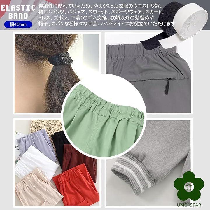 伸縮性に優れているため、ゆるくなった衣服のウエストや裾、袖口(パンツ、パジャマ、スウェット、スポーツウェア、スカート、ドレス、ズボン、下着)のゴム交換、衣類以外の髪留めや帽子、カバンなど様々な手芸、ハンドメイドにお役立ていただけます。
