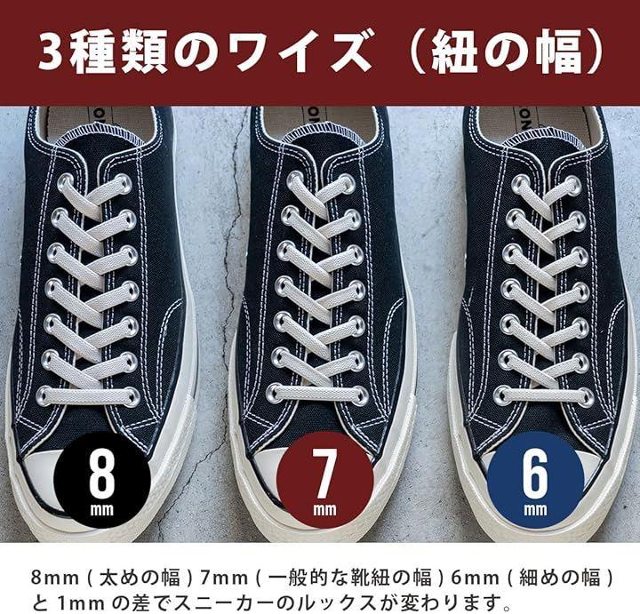 「スニーカーに合わせて選べるサイズ」 長さは80cm~180cmまで6種類(*180cmは8mm幅のみ)、幅は6mm / 7mm / 8mmの3タイプをご用意。