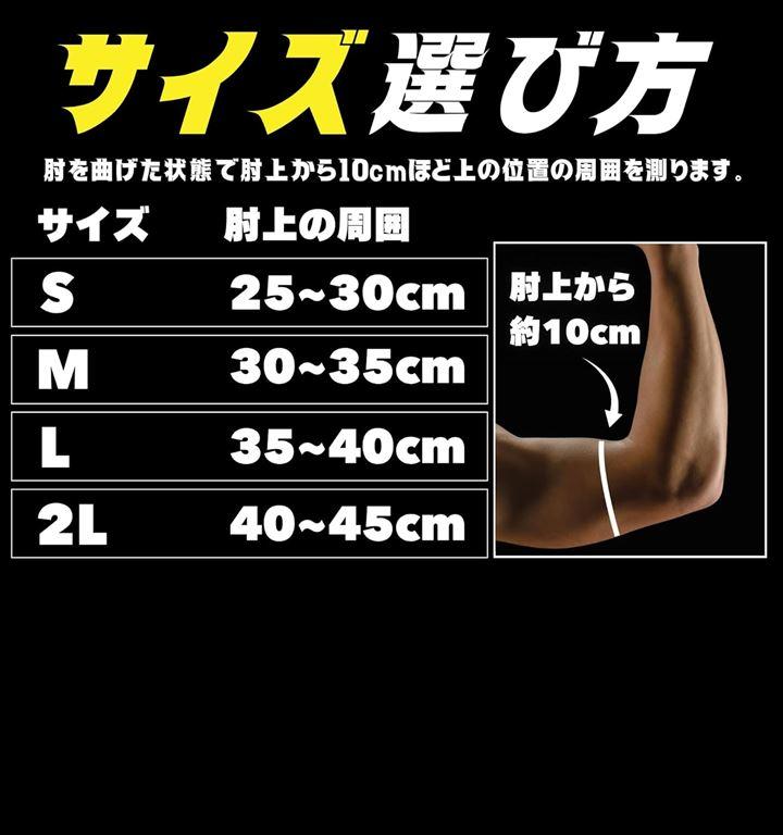 「サイズ・製品仕様」サイズは、肘から10cmほど 上の位置の周囲を測ります。
