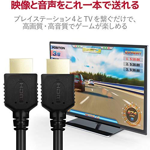 PlayStation(R)4とテレビを接続できる、“イーサネット対応HIGH SPEED HDMIケーブル"です。 4K2K、3DフルHDに対応した、HIGH SPEED with Ethernet認証済みの“イーサネット対応HIGH SPEED HDMIケーブル(カテゴリー2)"です。 HDMI出力端子を搭載したゲーム機(PlayStation(R)4、PlayStation(R)3、Xbox One、Xbox 360、Wii U(TM))の接続におすすめです。 1本のケーブルで、映像信号と音声信号をデジタルのままで高速伝送するだけでなく、イーサネット信号の双方向通信を実現します。 100Mbpsのイーサネット通信を実現する、HEC(HDMIイーサネットチャンネル)に対応しています。 デジタル音声をテレビなどの表示機器からAVアンプなどの出力機器へ伝送できる、ARC(オーディオリターンチャンネル)に対応しています。 3DフルHD(1080p×2画面)、4K2K(4096×2160ドット)に対応しています。