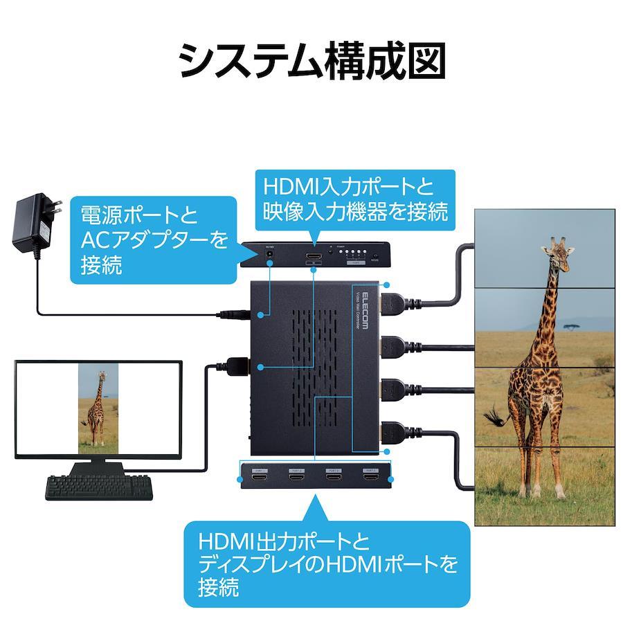 【 説明 】■1つの映像コンテンツを4枚のHDMI表示機器に分割表示または分配表示できるビデオウォールコントローラーです。■田の字や横4枚並びなど8つのレイアウトを選択可能です。デジタルサイネージでのマルチディスプレイ構築に活用できます。■最大4K(3840×2160)60Hz解像度のコンテンツが入力でき、Full HDで4枚ディスプレイに出力可能。■画面回転可能です。■※画面回転はMODE1のみです。■入力HDCP1.4/2.2、出力HDCP1.4対応により、著作権保護コンテンツにもご利用できます。■STB(セットトップボックス)、HDDレコーダー、BD/DVDプレーヤーの他、PlayStation(R) 5、PlayStation(R) 4、NINTENDO SWITCH(TM)などゲーム機も接続可能です。(すべての機器の動作を保証するものではありません。) (Playstation(R) 5の接続時は4K(3840×2160)60Hzまでの解像度とフレームレートに対応しています。8K解像度、及び4K120Hz解像度には対応しておりません。)■入出力側共に5m以内のケーブルをご使用ください。■(出力側は、「High Speed HDMIケーブル」以上のものをご使用ください。入力側は、2K解像度までは「High Speed HDMIケーブル」を、4K解像度では「Premium HDMIケーブル」をご使用ください。)■※HDMIケーブルは付属していません。別途ご購入ください。■パソコンご利用時は、ミラーリング・マルチディスプレイのどちらの出力画面設定でもご利用いただけます。■放熱効率が良くノイズに強いメタルケースを採用しております。■HDMI端子には金メッキ加工をしており、サビに強く信号劣化を防ぎます。■他の機器との混信を防ぐため、専用リモコン受信のON/OFFが設定できます。■専用リモコンにより、簡単にMODEを切り替えできます。■付属のイヤーマウントにより、壁などに固定することもできます。■自社環境認定基準を1つ以上満たし、『THINK ECOLOGY』マークを表示した製品です。■環境保全に取り組み、製品本体において、社内基準製品と同等以上の体積でありながら、原料に占めるプラスチック重量の割合を20%以上削減した製品です。■環境保全に取り組み、製品の包装容器が紙・ダンボール・ポリ袋のみで構成されている製品です。■環境保全に取り組み、製品の包装容器におけるプラスチック重量を、社内基準製品より20%以上削減した製品です。■法人で導入を検討されるお客さまは、ご購入前にお客様の環境での検証をおすすめ致します。