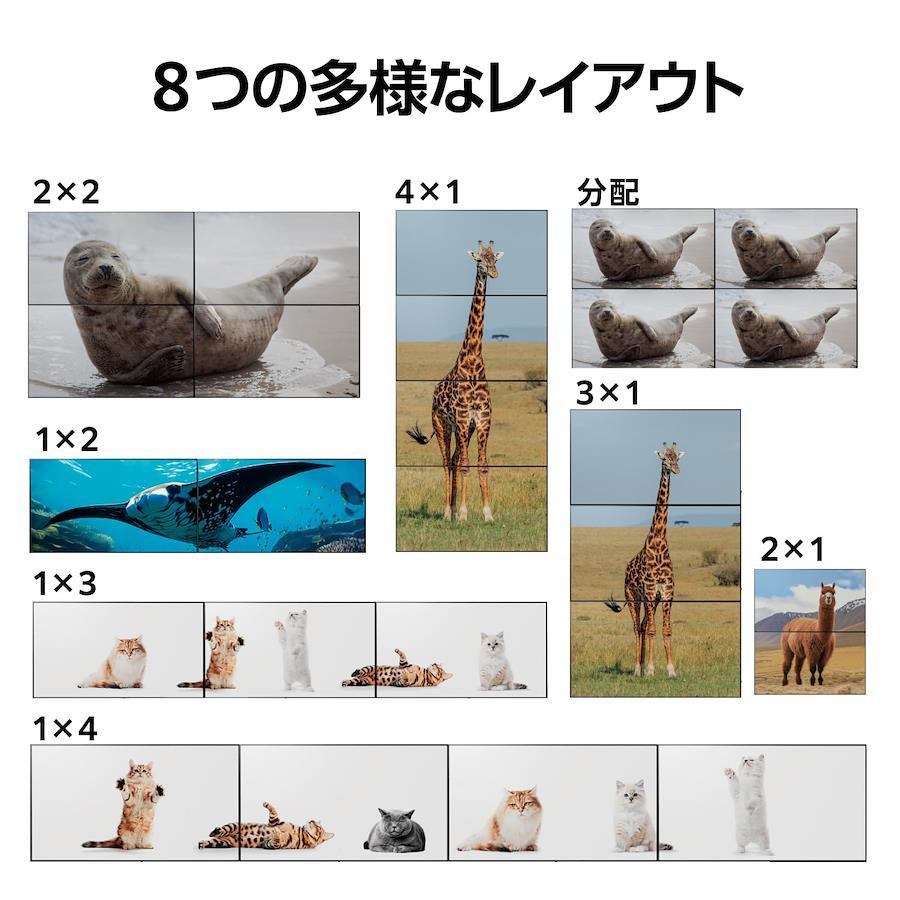 1つの映像コンテンツを4枚のHDMI表示機器に分割表示または分配表示できるビデオウォールコントローラーです。田の字や横4枚並びなど8つのレイアウトを選択可能です。デジタルサイネージでのマルチディスプレイ構築に活用できます。最大4K(3840×2160)60Hz解像度のコンテンツが入力でき、Full HDで4枚ディスプレイに出力可能。画面回転可能です。※画面回転はMODE1のみです。入力HDCP1.4/2.2、出力HDCP1.4対応により、著作権保護コンテンツにもご利用できます。STB(セットトップボックス)、HDDレコーダー、BD/DVDプレーヤーの他、PlayStation(R) 5、PlayStation(R) 4、NINTENDO SWITCH(TM)などゲーム機も接続可能です。(すべての機器の動作を保証するものではありません。) (Playstation(R) 5の接続時は4K(3840×2160)60Hzまでの解像度とフレームレートに対応しています。8K解像度、及び4K120Hz解像度には対応しておりません。)入出力側共に5m以内のケーブルをご使用ください。(出力側は、「High Speed HDMIケーブル」以上のものをご使用ください。入力側は、2K解像度までは「High Speed HDMIケーブル」を、4K解像度では「Premium HDMIケーブル」をご使用ください。)※HDMIケーブルは付属していません。別途ご購入ください。