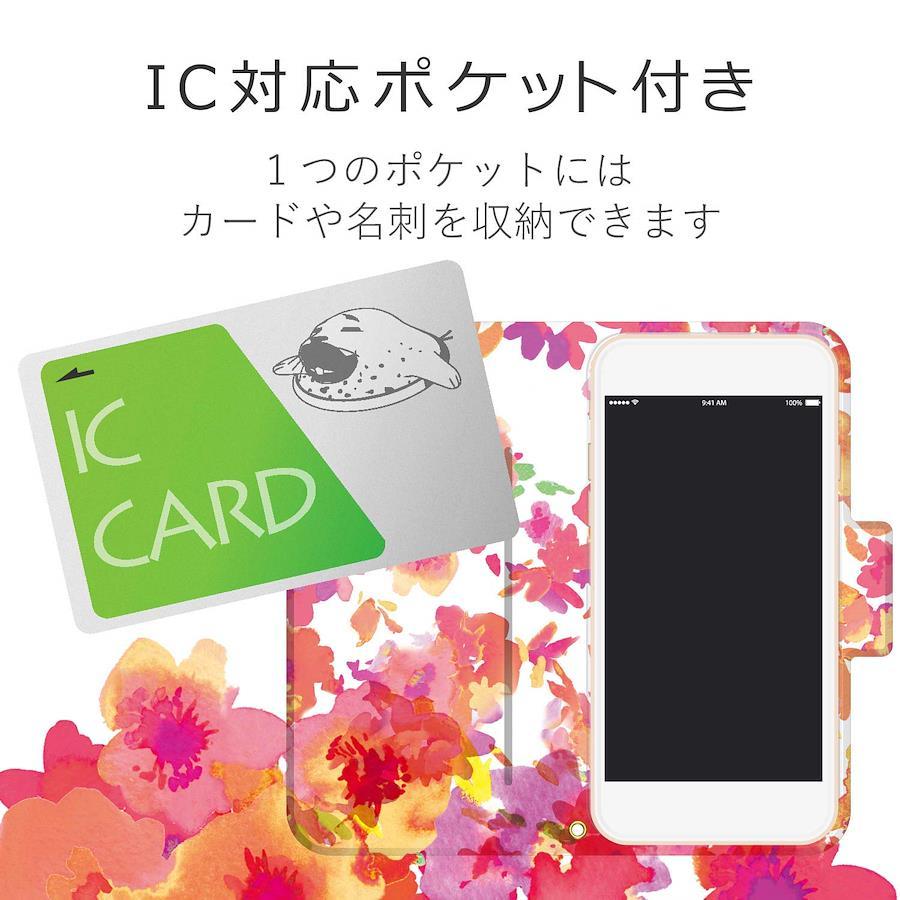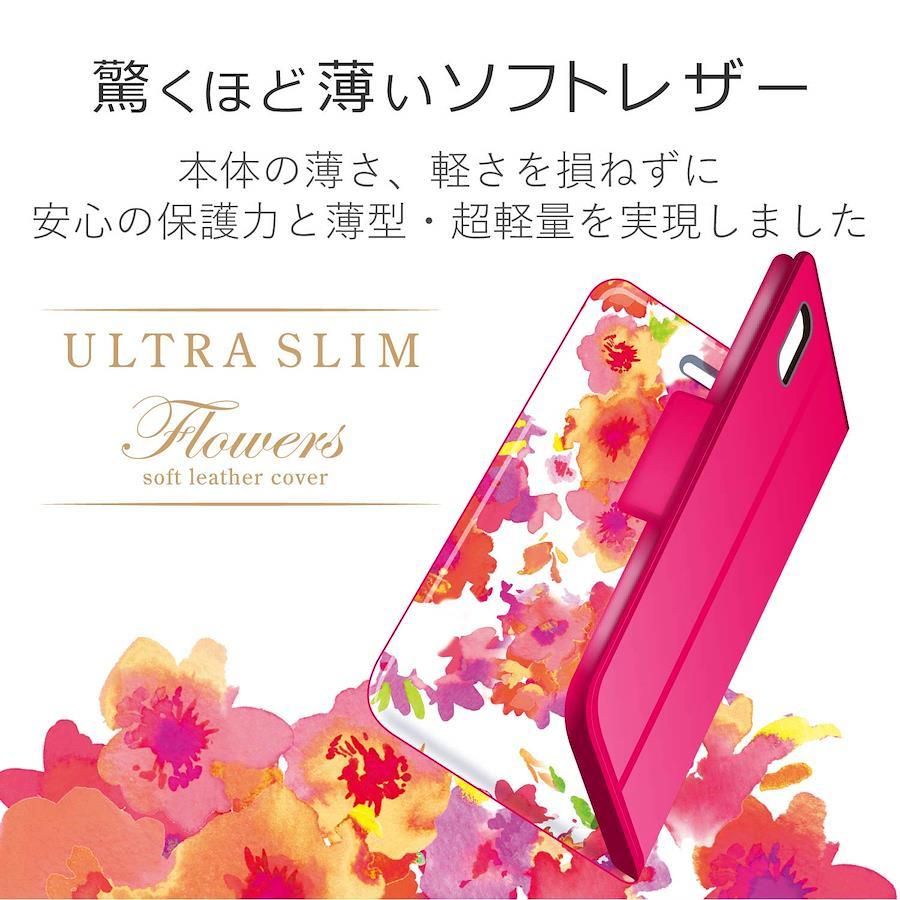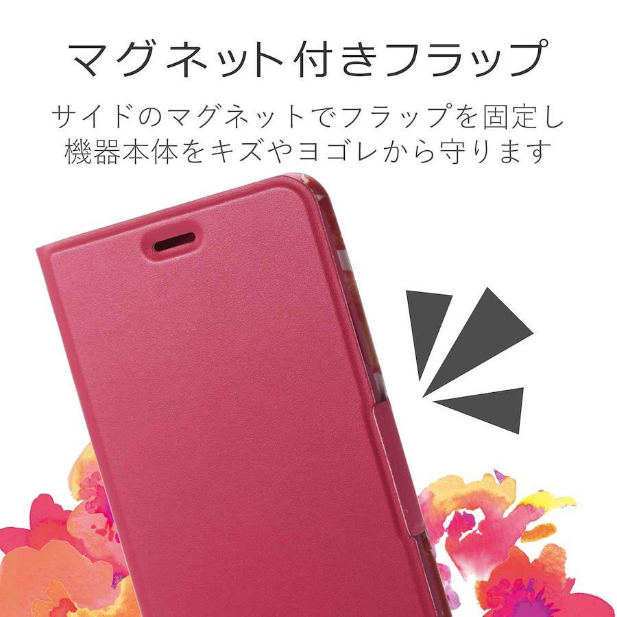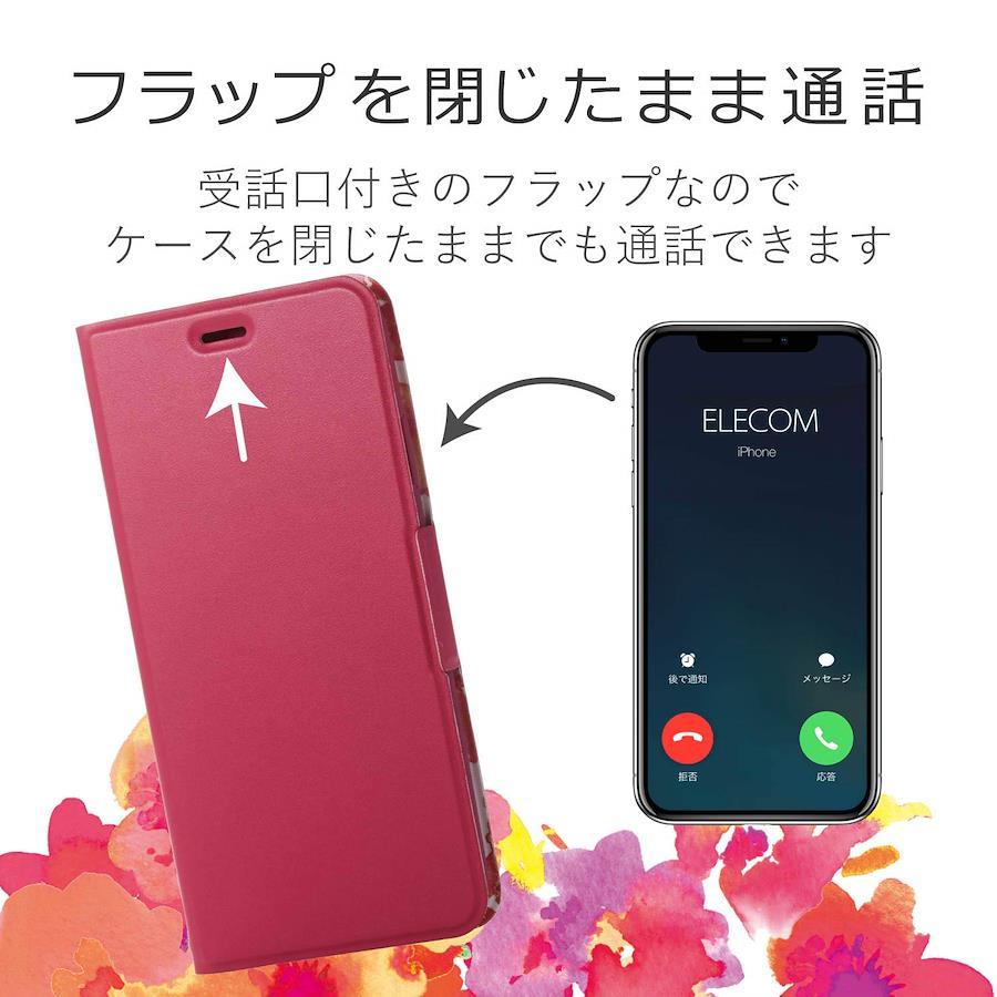 ■端末の薄さ、軽さを損ねないウルトラスリムタイプのiPhone2018/6.5インチ用ソフトレザーカバー(手帳型)です。■本体装着部分に衝撃を吸収するTPU素材を使用し、機器本体を衝撃から守ります。■カバー内側に、愛らしいフラワープリントを施しています。■未使用時に液晶画面部分をカバーする横開きタイプのフラップが付いています。■フラップにはスムーズに開閉できるサイドマグネットが付いています。端末へ磁力が影響しにくい設計のため、安心して使用可能です。■受話口付きフラップなので、フラップを閉じたまま通話が可能です。■カバー内側に1つのカードポケットが付いています。■背面を折り曲げることでスタンドとして使用でき、動画視聴などを快適に楽しめます。■ストラップの取り付けが可能なストラップホールが付いています。■カバーを装着したままで、純正の各種ケーブルの接続や写真撮影、ボタンの操作が可能です。