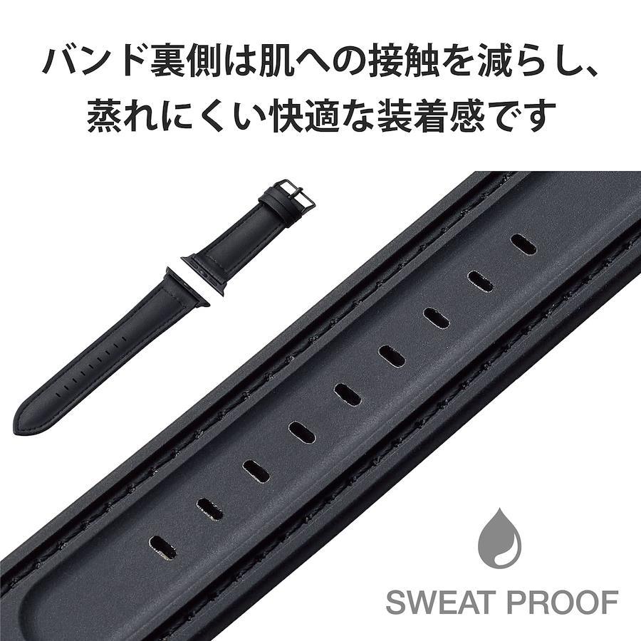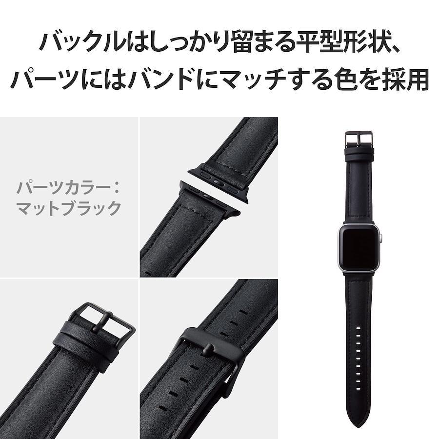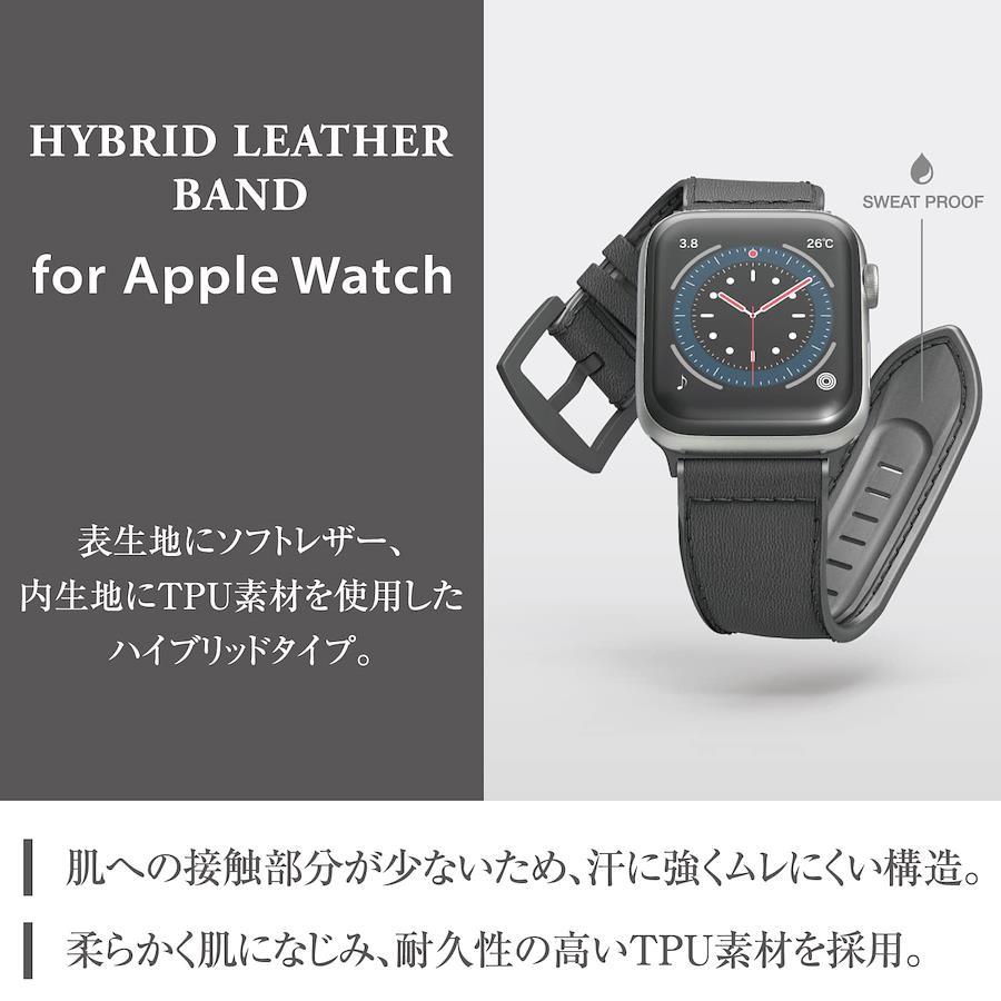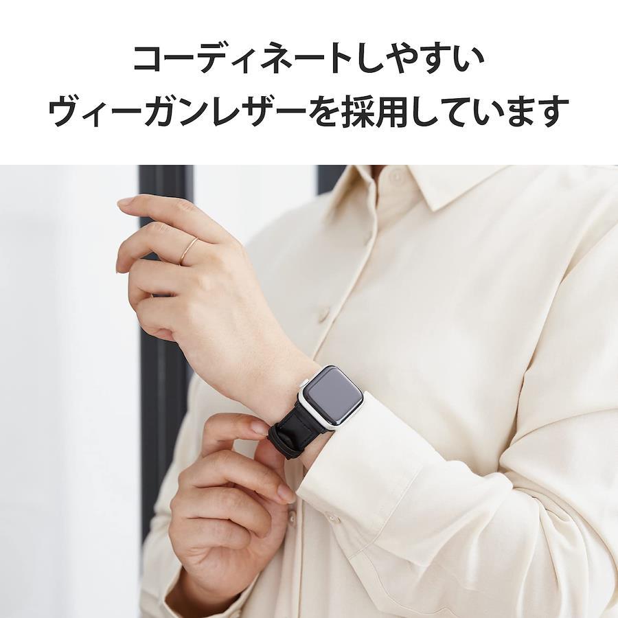 【 説明 】■ コーディネートしやすいヴィーガンレザーと、耐久性の高いTPU素材を組み合わせたApple Watch用ハイブリッドレザーバンドです。■ バンド裏側は肌への接触部分を最小限に抑える形状にすることで、装着感の高さと蒸れにくさを両立しています。■ シボ目の細かいしなやかなヴィーガンレザーを採用し、バンド中心線が盛り上がる甲丸型に、剣先をボート形状にしたスタンダードなスタイルです。■ ※ヴィーガンレザー【Vegan Leather】とは、動物の革を使用せずに本革の美しい風合いを再現したソフトレザーです。動物愛護の観点から海外でも注目されている素材です。■ 明るさを抑えたダークトーンでまとめているため、ビジネスシーンでもコーディネートしやすくなってます。■ バックルとラグの金属部分はマットブラックで仕上げており、背面TPU部と合わせたカラーにしています。■ Apple Watchとバンドを接続するラグ部分は、外側からネジが見えず外れにくい独自構造設計です。■ バックルの突棒はしっかり留まるように平型形状にデザインしています。■ バンドをApple Watchに装着したままで液晶画面の確認、本体の操作、各種ボタン操作、純正の磁気充電ケーブルへの設置が可能です。■ 自社環境認定基準を1つ以上満たし、『THINK ECOLOGY』マークを表示した製品です。■ 環境保全に取り組み、製品の包装容器におけるプラスチック重量を、社内基準製品より20%以上削減した製品です。