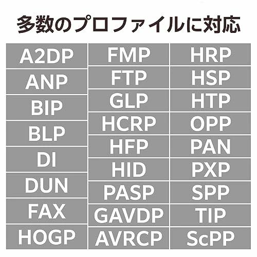 対応Bluetoothプロファイル:A2DP/ANP/AVRCP/BIP/BLP/DI/DUN/FAX/FMP/FTP/GAVDP/GLP/HFP/HID/HOGP/HRP/HSP/HCRP/HTP/OPP/PAN/PASP/PXP/ScPP/SPP/TIP