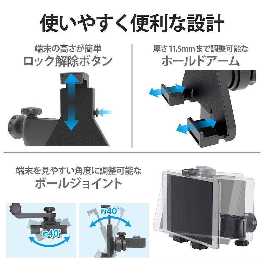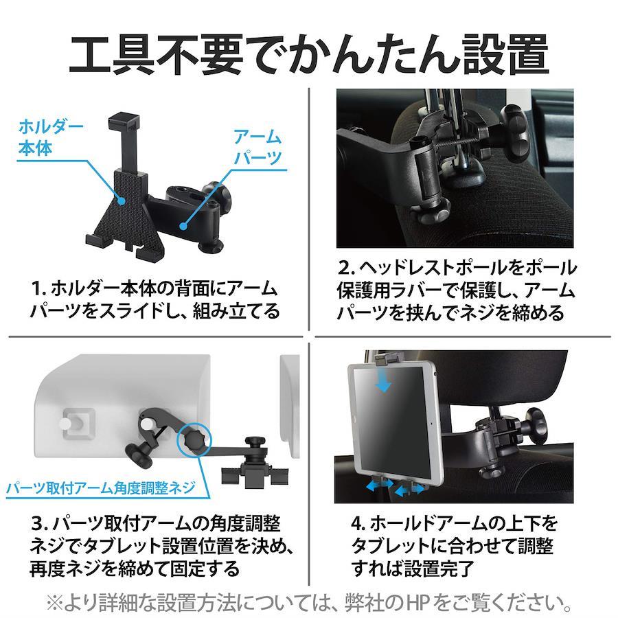 ■ その他:ヘッドレストポール取付(ポール直径7~13mm、ポール露出42mm以上)、中型タブレット対応