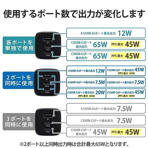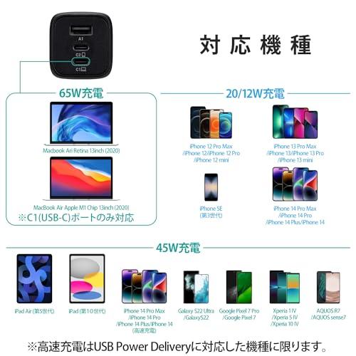 ■対応機種:各USB Type-C(USB-C)ポートからUSB Power Delivery (65W)及びオプション規格であるPPS(Programmable Power Supply)、またはUSB-Aポートから12Wの規格内で充電が可能な機器。2ポート以上同時接続時、合計最大65Wまでの出力で充電、給電可能な機器とその組み合わせ。