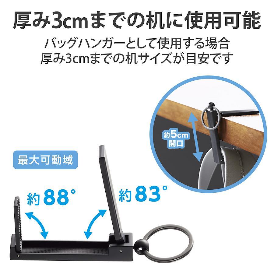 折りたたんでコンパクトに持ち運びでき、出先でも鞄を床置きしないバッグハンガー機能付きのスマートフォン用コンパクトスタンドです。折りたたんでコンパクトに持ち運びできるスマートフォン用コンパクトスタンドです。開口することで4.6~6.7inch(W78mm×D7mm×H160mmまで)のスマートフォンを立てかけることができます。バッグハンガー機能付きのため、出先でも鞄を床置きせずに清潔に保ちます。※スタンド機能とバッグハンガー機能を同時に使用することはできません。最大約5cmの開口のため、使用できる机などの厚みは3cmまでが目安です。キーリング付きで持ち運びに便利です。