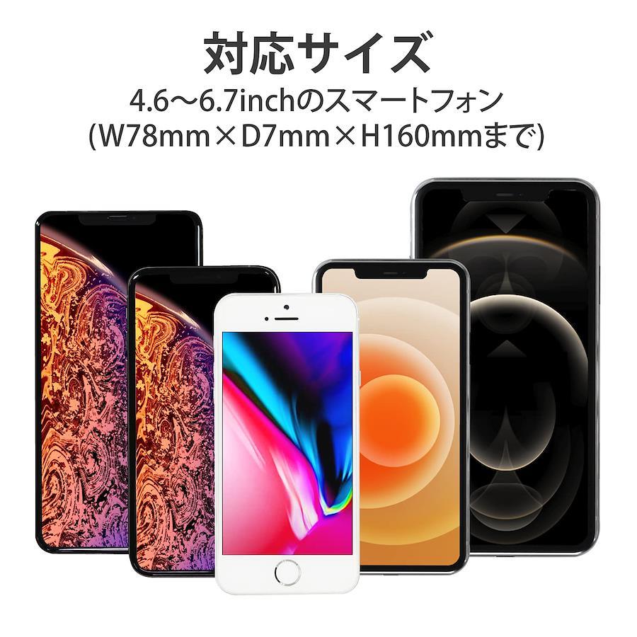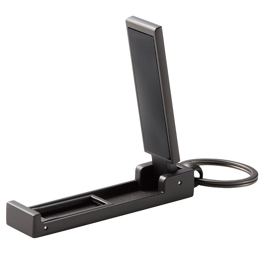 【 仕様 】■外形寸法:幅約18mm×高さ約74mm×奥行約11mm(収納時本体)、Φ約32mm(キーリング)■重量:約61g■カラー:マットブラック■材質:本体:亜鉛合金、バッグハンガー接地部分:シリコン■角度調節:×■対応機種:4.6~6.7inch(W78mm×D7mm×H160mmまで)■耐荷重:約4.5kg(バッグハンガー)