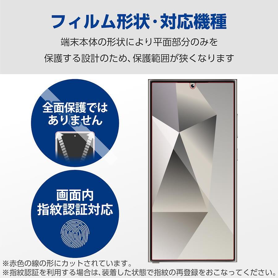 【 仕様 】■対応機種:Galaxy S24 Ultra(SC-52E)■セット内容:画面保護フィルム(指紋防止、高透明仕様)×1、クリーニングクロス×1、ホコリ取りシール×1■材質:接着面:シリコン、外側:PET