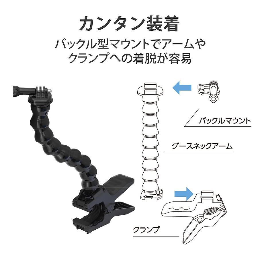 【 説明 】■自由なアングルで撮影でき、強力なクランプで固定できるグースネックタイプのGoPro HERO12/11/10/9/8/MAXなどのアクションカメラ用マウントです。■自由に動かせる360度回転可能の多関節フレキシブルアームなので、カメラアングルを適切な角度に調節できます。■強力なバネのクランプで、厚み0.6-5cmのものに挟み込んで固定できます。■クランプからアームを取り外し、クランプに直接クイックリリースバックルマウントを取り付けることができます。■自社環境認定基準を1つ以上満たし、『THINK ECOLOGY』マークを表示した製品です。■環境保全に取り組み、製品の包装容器が紙・ダンボール・ポリ袋のみで構成されている製品です。