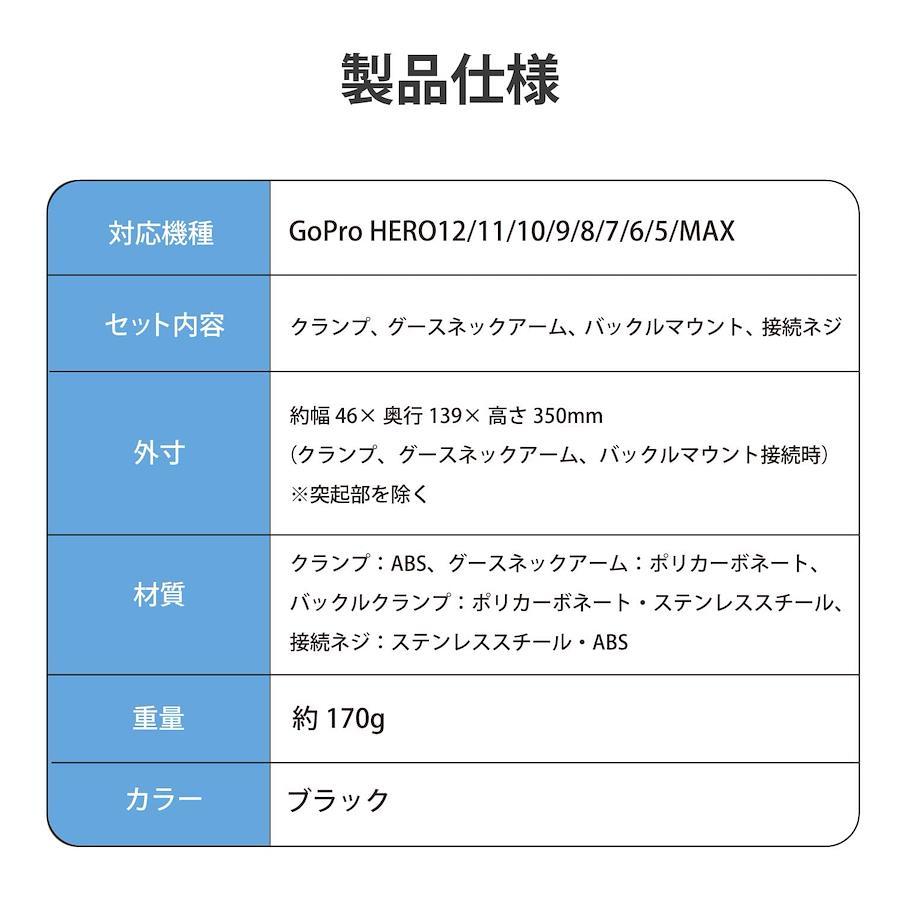 【 仕様 】■対応機種:GoPro HERO12/11/10/9/8/MAX■セット内容:クランプ、グースネックアーム、バックルマウント、接続ネジ■外寸:約幅46×奥行139×高さ350mm(クランプ、グースネックアーム、バックルマウント接続時)※突起部を除く■材質:クランプ:ABS、グースネックアーム:ポリカーボネート、バックルクランプ:ポリカーボネート・ステンレススチール、接続ネジ:ステンレススチール・ABS■重量:約226g■カラー:ブラック■その他:固定可能はさみ幅:厚み6~50mm