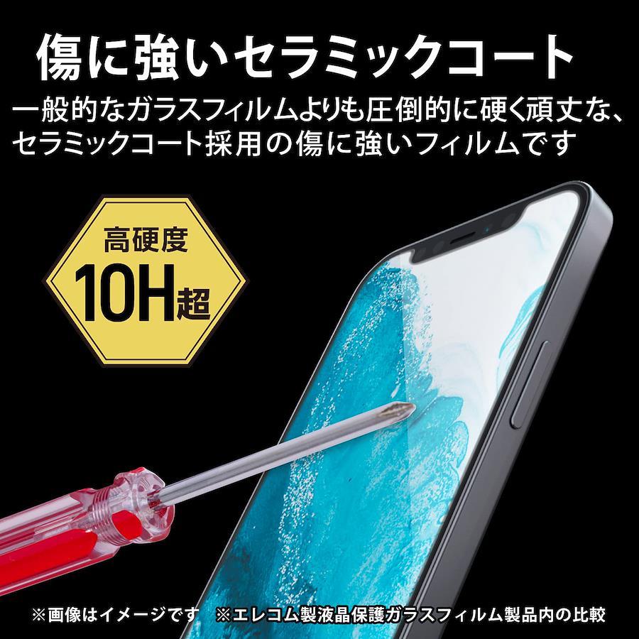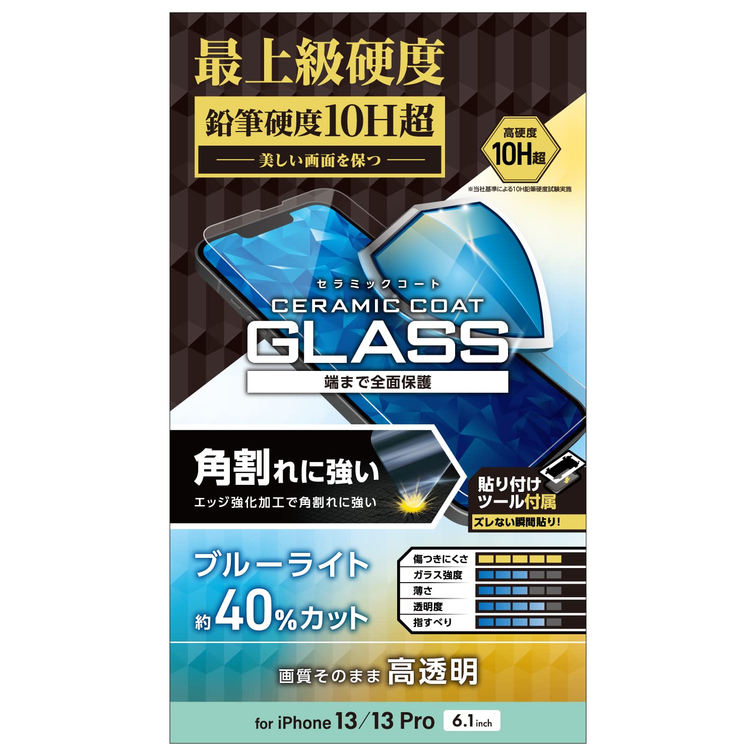 鉛筆硬度10H以上のセラミックコートにより傷に強く、エッジ強化加工で角割れにも強いブルーライトカットタイプのiPhone 13 / iPhone 13 Pro用ガラスフィルムです。