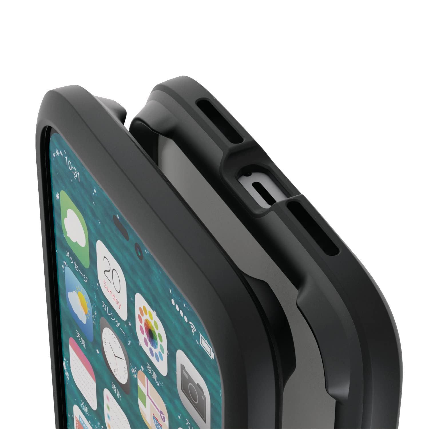 全周に配置した独自設計のエアクッションが衝撃を吸収し、2種の素材を特殊成形したiPhone 14 Pro Max用TOUGH SLIM LITEバンパーです。