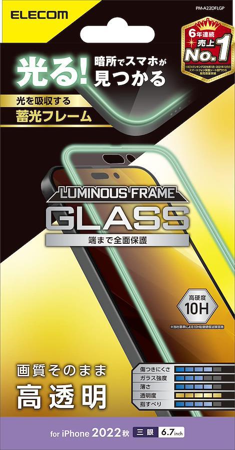 【説明】■ガラス特有のなめらかな指滑りを実現する高透明タイプのガラスの縁部分に蓄光フレーム加工を施したiPhone 14 Pro Max用液晶保護ガラスです。■明るい時に受けた光を蓄えて、暗い場所で蓄えた光を時間をかけてフレームが発光する液晶保護ガラスです。■高精細液晶を損ねない高い透明度を実現します。■表面硬度10Hの強化ガラス採用により、保護ガラス表面の傷を防止します。 ※当社基準による10H鉛筆硬度試験での実力値です。■貼り付け面にシリコン皮膜をコーティングし、接着剤や両面テープを使わずに貼り付け可能な自己吸着タイプです。貼りやすく、貼り直しも可能です。■時間の経過とともに気泡が目立たなくなる特殊吸着層を採用したエアーレスタイプです。■指紋・皮脂汚れが付きにくく、残った場合でも簡単に拭き取れる指紋防止加工を施しています。■端末の形状に合わせたサイズにカット済みなので、パッケージから取り出してすぐに使用可能です。■フィルムを貼ったままでも本体操作ができるタッチスクリーン入力に対応しています。■特殊な飛散防止設計により、万一割れてしまった際にもガラス片が飛散することなく、高い安全性を実現しています。■自社環境認定基準を1つ以上満たし、『THINK ECOLOGY』マークを表示した製品です。■廃棄物削減に取り組み、製品に同梱する取扱説明書等をペーパーレス化した製品です。■環境保全に取り組み、製品の包装容器において、原料に占める石油系プラスチック代替原料の割合が10%を超えている製品です。
