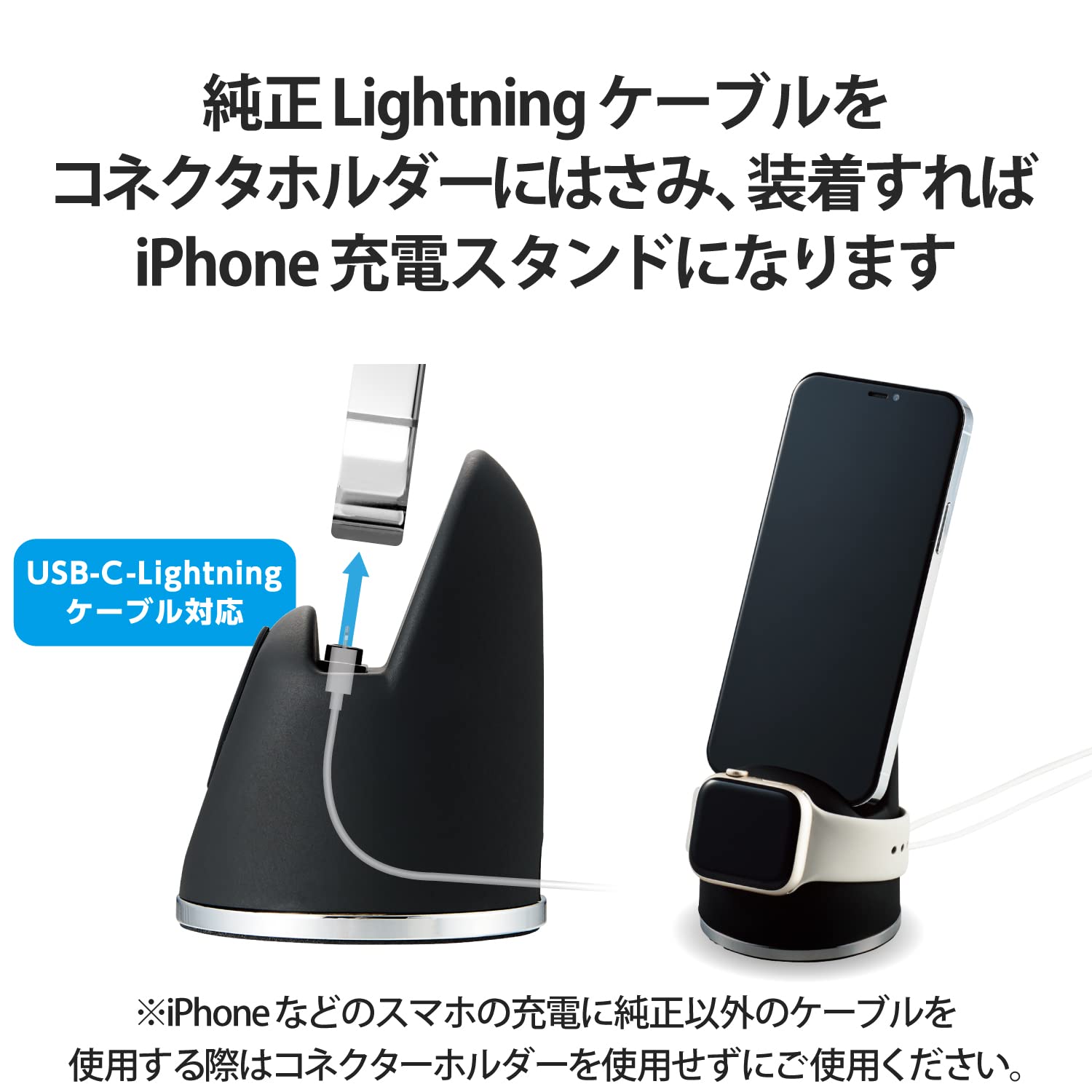 純正USB-C(TM) Lightningケーブルに対応するコネクターホルダーを付属しているので、2021年以降に発売されたiPhone付属の純正Lightningケーブルにも対応します。