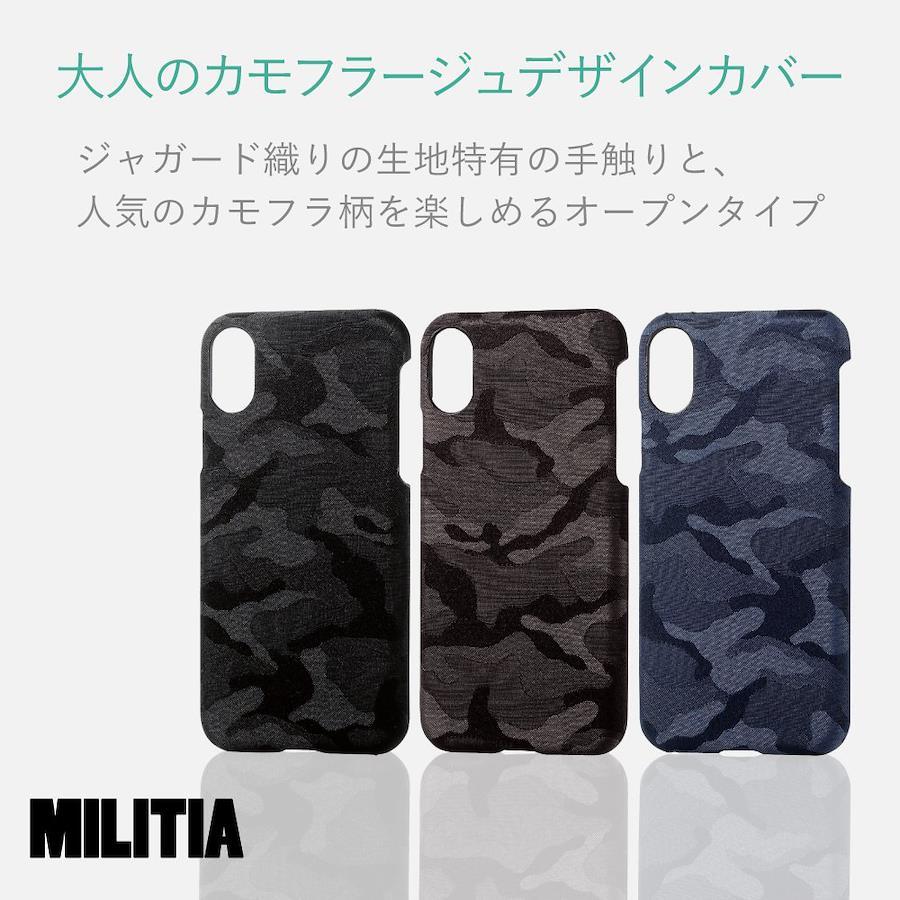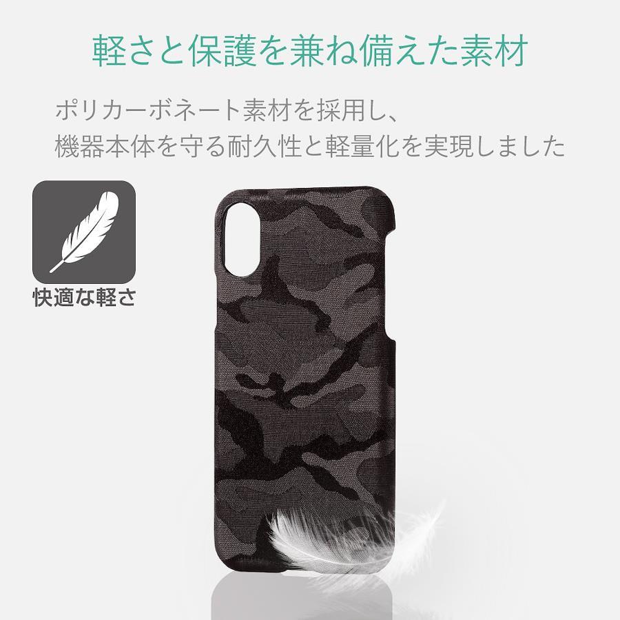 【対応機種】:iPhone X人気のカモフラ柄をさりげなく楽しめるオープンタイプのiPhone X用ファブリックカバー/オープン/カモフラです。生地特有の手触りを楽しめるジャガード織りを採用しています。芯材に強じんなポリカーボネートを使用し、スリムなデザインを保ちつつ、iPhone本体をしっかりと保護します。強じんさを保ちながら軽量化を実現し、快適に使用可能です。画面の縁を覆わないため指の引っかかりがなく、快適に操作できます。カバーを装着したままで、純正の各種ケーブルの接続や写真撮影、ボタンの操作が可能です。