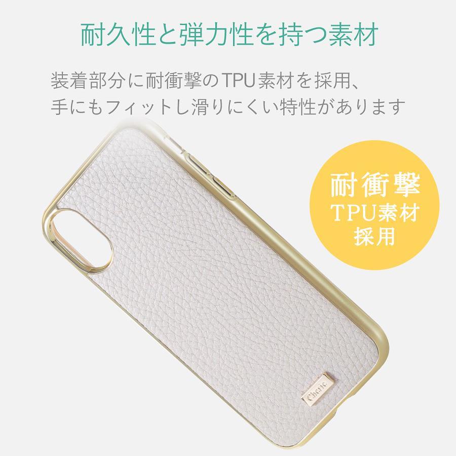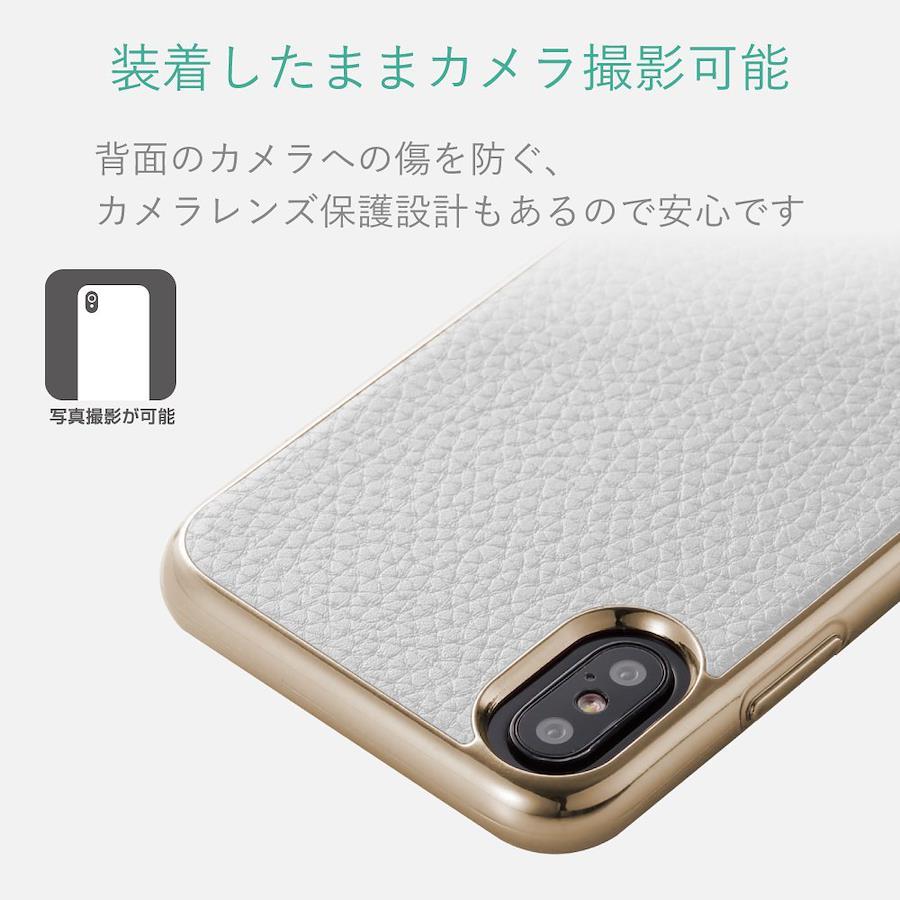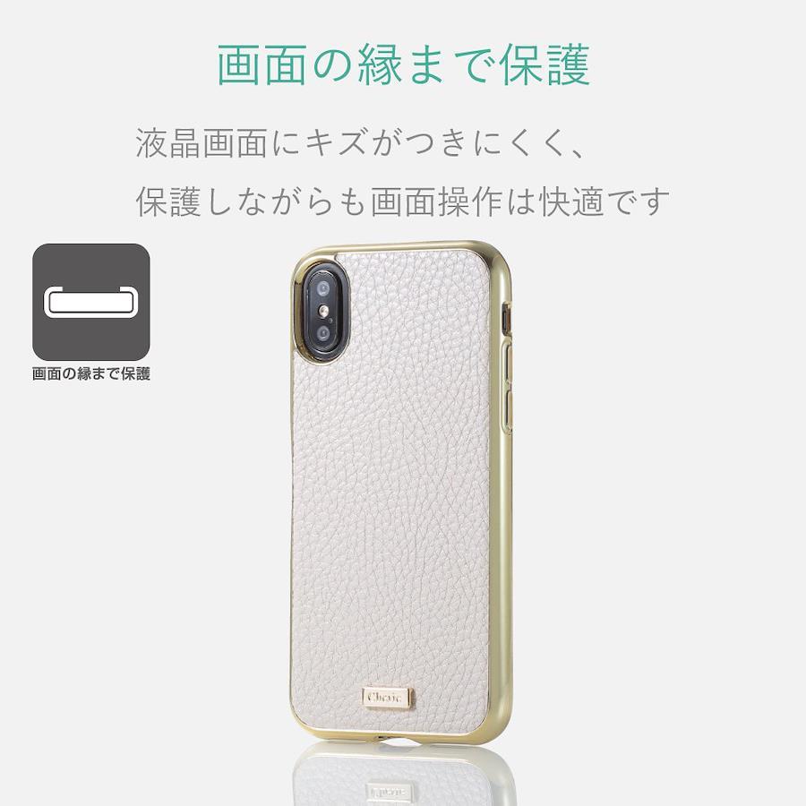 【対応機種】:iPhone X背面にソフトレザーを貼り付け、生地に合わせたゴールドメッキを施した、レザーアクセサリーのようなエレガントなiPhone X用ソフトケースです。衝撃吸収力が強いTPU(熱可塑性ポリウレタン)を使い、画面の縁までしっかり保護します。側面部分のメッキ加工とワンポイント、背面のソフトレザーでエレガントなレザーアクセサリーに仕上げました。側面部分にメッキ加工を施した上品な輝きを放つ高級感あるソフトケースです。シリコン素材より強く耐久性に優れ、プラスチック素材よりしなやかな弾力性を持つTPU(熱可塑性ポリウレタン)素材を使用しています。力があまりなくても実機が着脱しやすい柔らかく丈夫なTPU素材を採用して使いやすくしました。カバー内側には本体を傷つけにくい起毛素材を採用しています。各種コネクタやボタン周りまでカバーが覆うので、安心して使用できます。液晶画面をケースが覆わないので、文字入力などが快適に操作可能です。背面カメラ周りを覆い、カメラへの傷を防ぐ、カメラレンズ保護設計です。