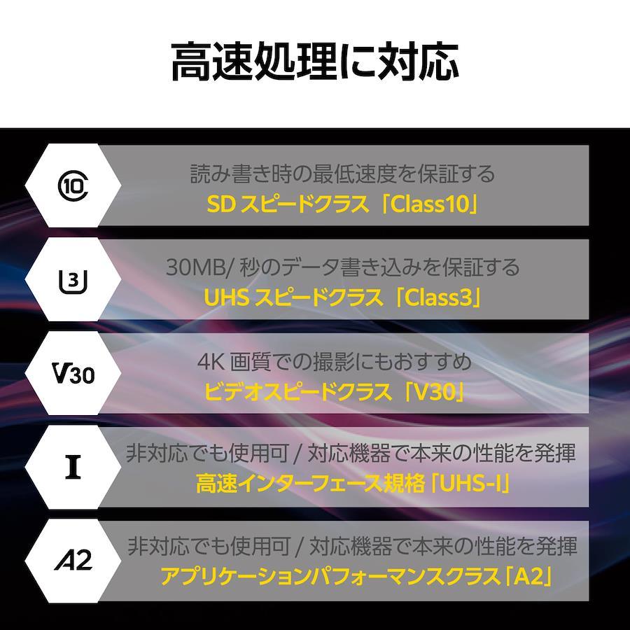 読み書き時の最低速度を保証するSDスピードクラスの「Class10」/UHSスピードクラスの「Class3」/ビデオスピードクラス「V30」に対応したSDカードです。