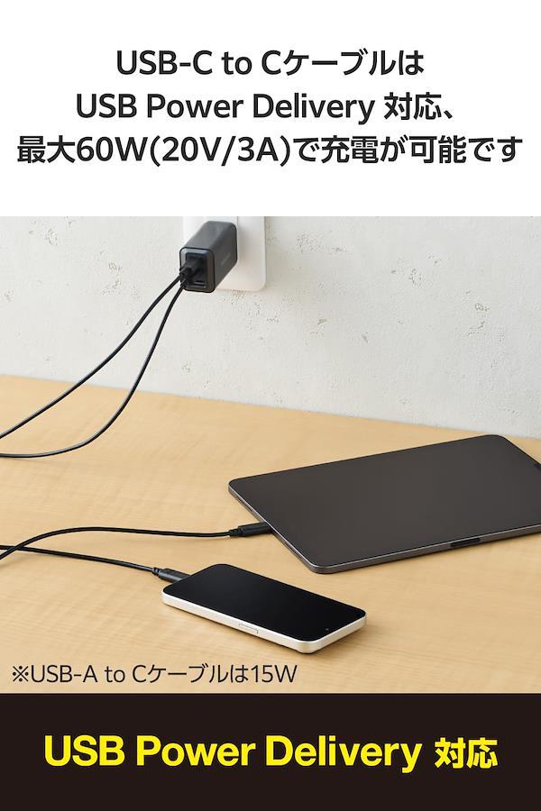 スマートフォンやタブレットの充電やデータ転送に!USB-A - USB Type-C(TM)ケーブル、USB Type-C - USB Type-Cケーブルの2種類のケーブルセットです。USB-Aポート、USB Type-Cポート搭載のAC充電器・モバイルバッテリー・パソコンと、USB Type-Cポート搭載のスマートフォン・タブレットなどを接続し、充電やデータ転送ができます。USB2.0に対応しています。最大480Mbpsの高速データ転送が可能です。 ※理論値USB Type-C - USB Type-CケーブルはUSB Power Deliveryに対応し、最大60Wで充電が可能です。スマートフォンやタブレット、一部のパソコンなどに使用できます。 ※USB-A - USB Type-CケーブルはUSB Power Delivery非対応。