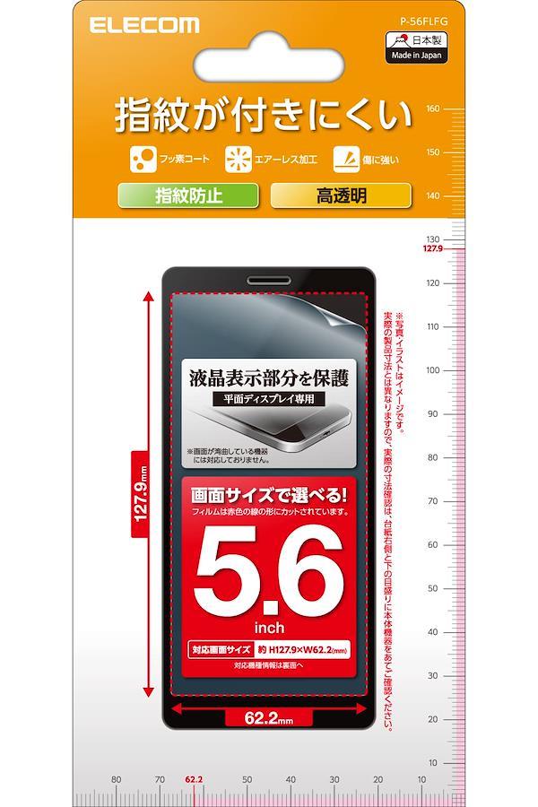 5.6インチスマートフォンの液晶表示部を傷や汚れから守る、指紋防止タイプの高透明フィルムです。機種専用の液晶保護フィルムが見つからない方にも最適です。表示画面サイズ5.6インチ(画面解像度1480×720ドット、または2220×1080ドット)に対応しています。※湾曲した液晶画面には対応しない場合がありますので、必ずエレコムホームページから対応表をご確認ください。つやのある高透明タイプで、液晶表示部を鮮やかに彩ります。貼り付け面にシリコン皮膜をコーティングし、接着剤や両面テープを使わずに貼り付け可能な自己吸着タイプです。貼りやすく、貼り直しも可能です。