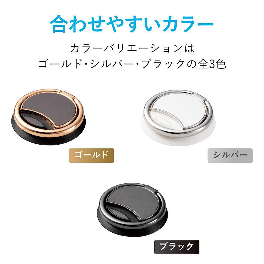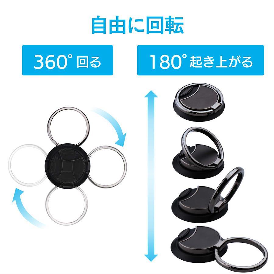 ★Point★ボタン1つでリングの取り外しが可能なので ワイヤレス充電器を使用することができます。持ち方・使い方に合わせて リングを回転・角度を変えたり スタンドにすることが可能です。当社試験をクリアした吸着シートにより 使用中にスマートフォンから剥がれるのを防止します。★商品説明★背面に貼りつけることで指を通してスマートフォンを持つことができ スマートフォンの落下を防ぐフィンガーリングです。【サイズ】 収納時:約(W)34.0×(D)6.5×(H)34.0mm / 貼り付け面:約(W)34.0×(H)34.0mm【セット内容】 フィンガーリング×1 吸着強化フィルム×1 交換用両面テープ×2【材質】 亜鉛合金(吸着面:アクリル系粘着)【カラー】 ブラック