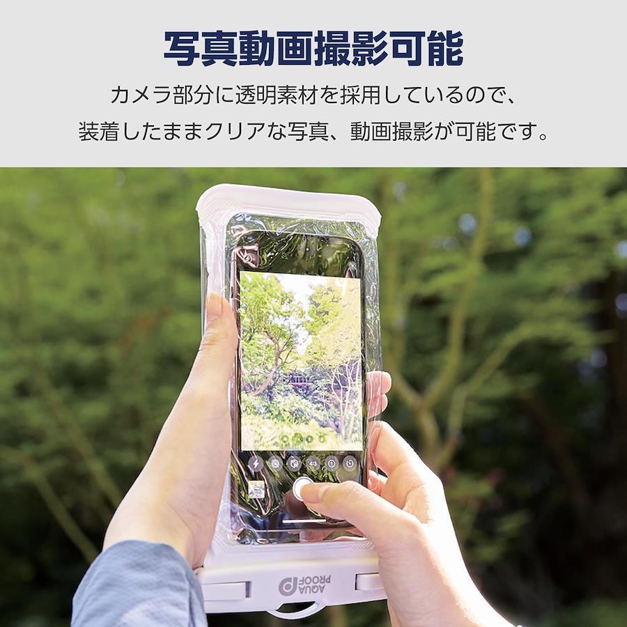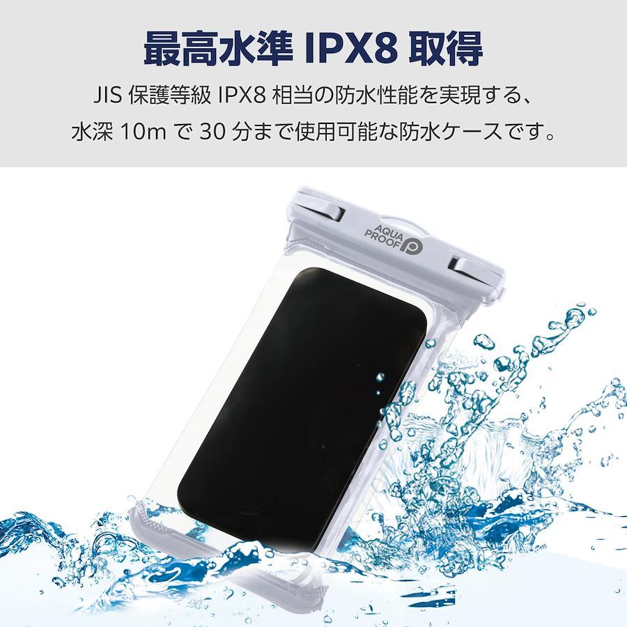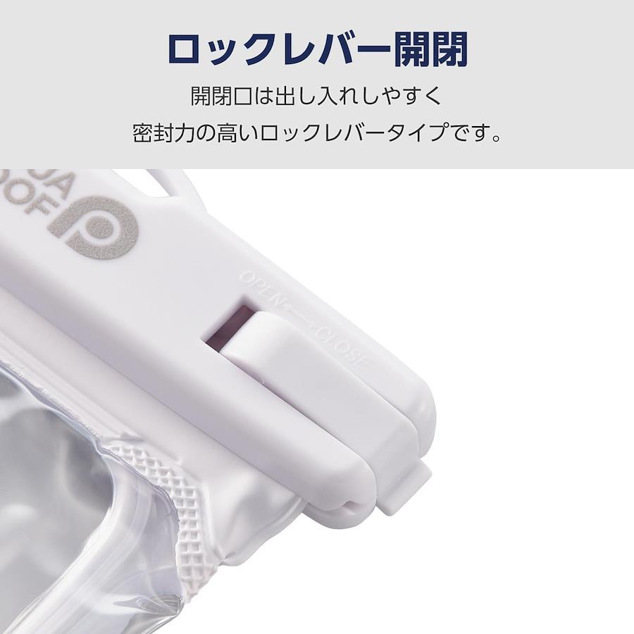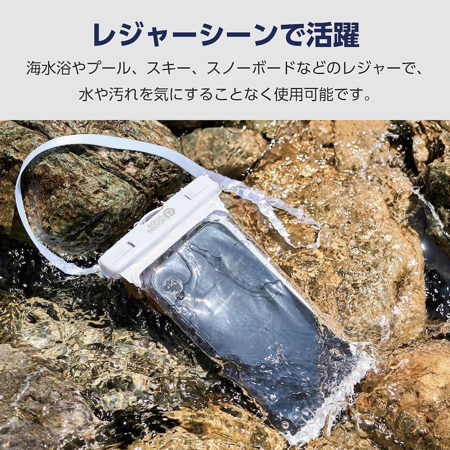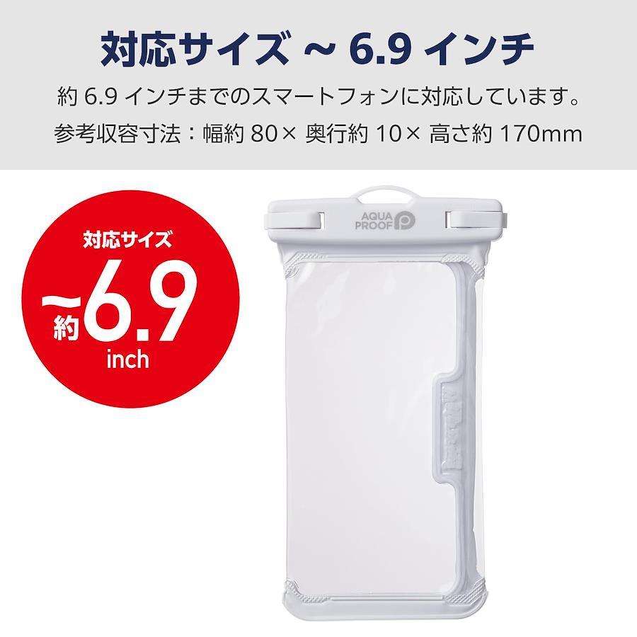 【 説明 】■JIS保護等級 IPX8相当の防水性能を実現する、水深10mで30分まで使用可能なスマートフォン用防水ケース“AQUA PROOF"です。■海水浴やプール、スキー、スノーボードなどのレジャーで、水や汚れを気にすることなくスマートフォンを使用可能です。■開閉口は出し入れしやすく密封力の高いロックレバータイプです。■サイドボタンが押しやすい操作性抜群の立体構造です。■ケースに入れたまま、タッチパネルの操作が可能です。■※指紋認証機能は使用できません。■ケースを装着したまま動画、音楽鑑賞も楽しめます。■カメラ部分に透明素材を使用しているので、装着したままクリアな写真、動画撮影が可能です。■FaceID、顔認証に対応しています。■持ち運びに便利なネックストラップが付属しています。■約6.9インチまでのスマートフォンに対応しています。■自社環境認定基準を1つ以上満たし、『THINK ECOLOGY』マークを表示した製品です。■環境保全に取り組み、製品の包装容器が紙・ダンボール・ポリ袋のみで構成されている製品です。