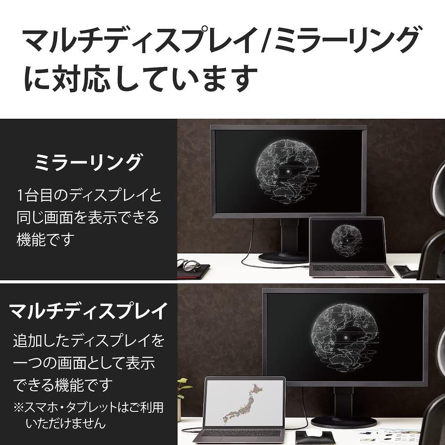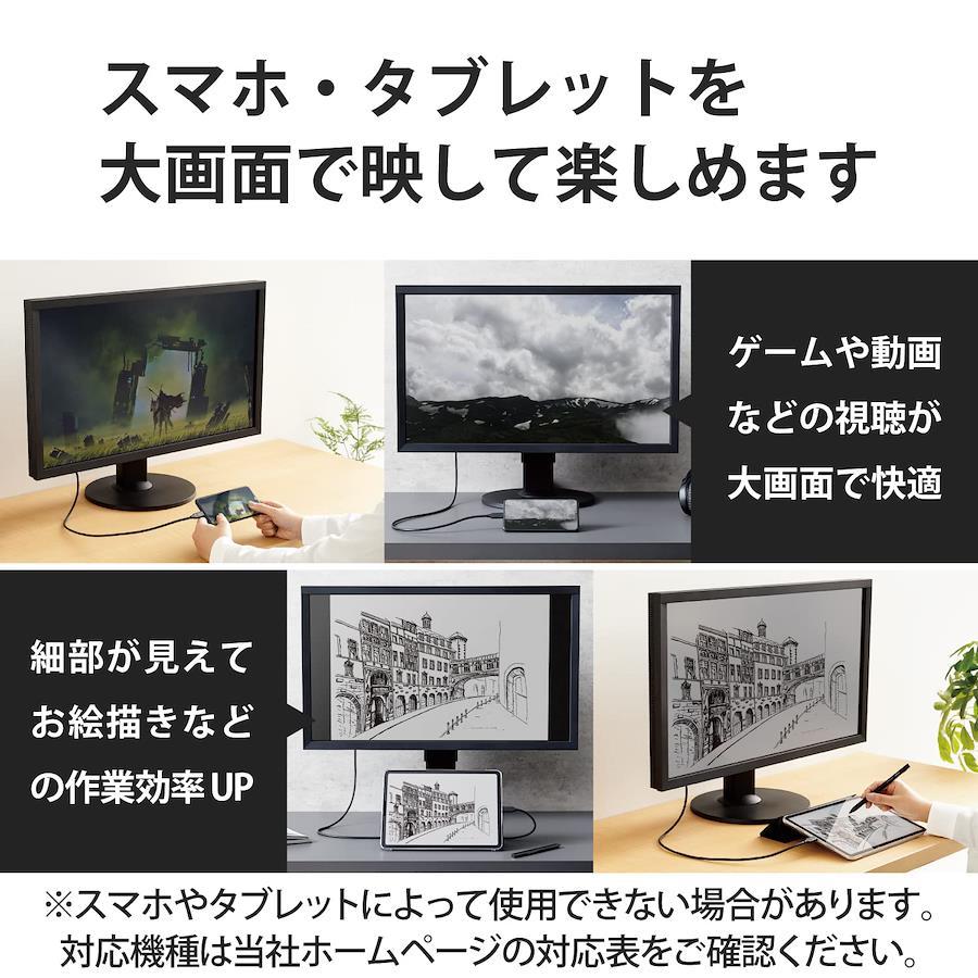 【 説明 】■USB Type-C(TM)端子搭載パソコン、スマートフォン、タブレットなどの映像信号をHDMI入力端子を搭載したディスプレイなどに出力することができる映像変換ケーブルです。■配線しやすくクセが残りにくい、やわらかケーブルを採用しています。■著作権保護技術のHDCP1.4/HDCP2.2に対応しています。■ドライバーは不要で、本製品1本で高画質映像と音声を伝送できます。■HDMIケーブルを追加で準備する必要がなく、簡単に接続が可能です。■4K2K(3840×2160/60Hz)の解像度に対応しています。■ディスプレイに接続し、画面を拡張して使用できるマルチディスプレイ、接続端末と同じ画面を表示するミラーリング、両方に対応しています。■※スマートフォン・タブレットの機種によってはマルチディスプレイに対応していない場合がございます。■デジタル音声出力に対応しています。■アダプタの本体内部には、シールド効果が高く、外部ノイズの影響を受けにくい金属シェル構造を採用しています。■外部ノイズの干渉を受けにくい3重シールドケーブルを採用しています。■※当製品はIC搭載のアクティブタイプです。■※HDMIからUSB Type-C(TM)への変換はできません。■※音声出力に対応しています。■※映像が正しく表示されない場合は、接続先のディスプレイの電源ON/OFFや各接続コネクターの抜き差しをお試し下さい。■※環境、機器により正常に動作しない場合があります。■※本製品で映像出力を行う際は、出力機器がDisplayPort Alt Mode対応であることをご確認ください。■※NINTENDO SWITCH(TM)には対応しておりません。■※USB Type-C and USB-C are trademarks of USB Implementers Forum■サビなどに強く信号劣化を抑える金メッキピンを採用しています。■EUの「RoHS指令(電気・電子機器に対する特定有害物質の使用制限)」に準拠(10物質)した、環境にやさしい製品です。■自社環境認定基準を1つ以上満たし、『THINK ECOLOGY』マークを表示した製品です。■環境保全に取り組み、製品の包装容器におけるプラスチック重量を、社内基準製品より20%以上削減した製品です。