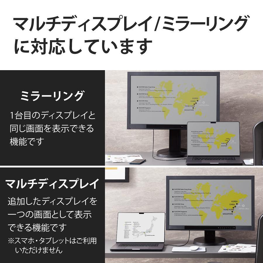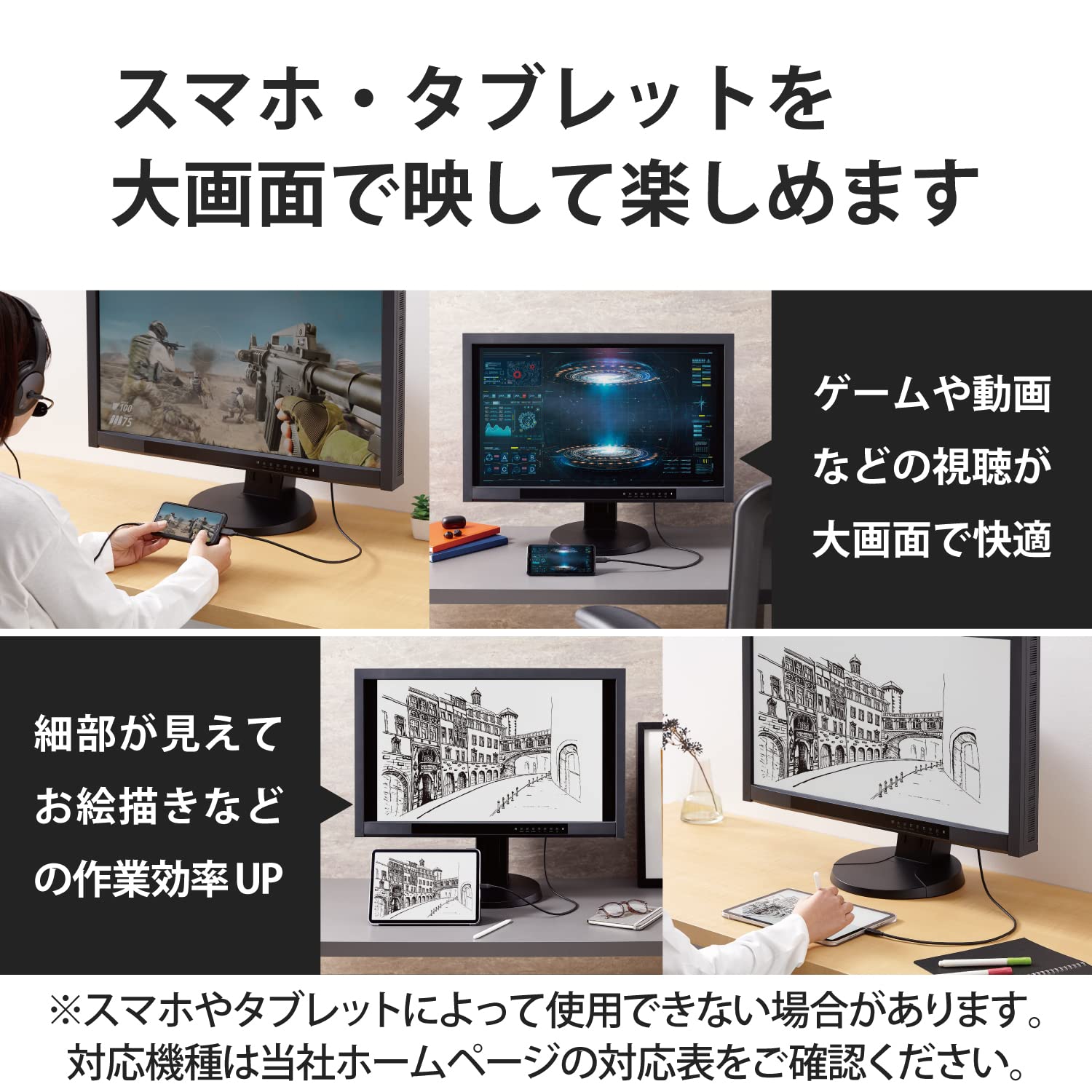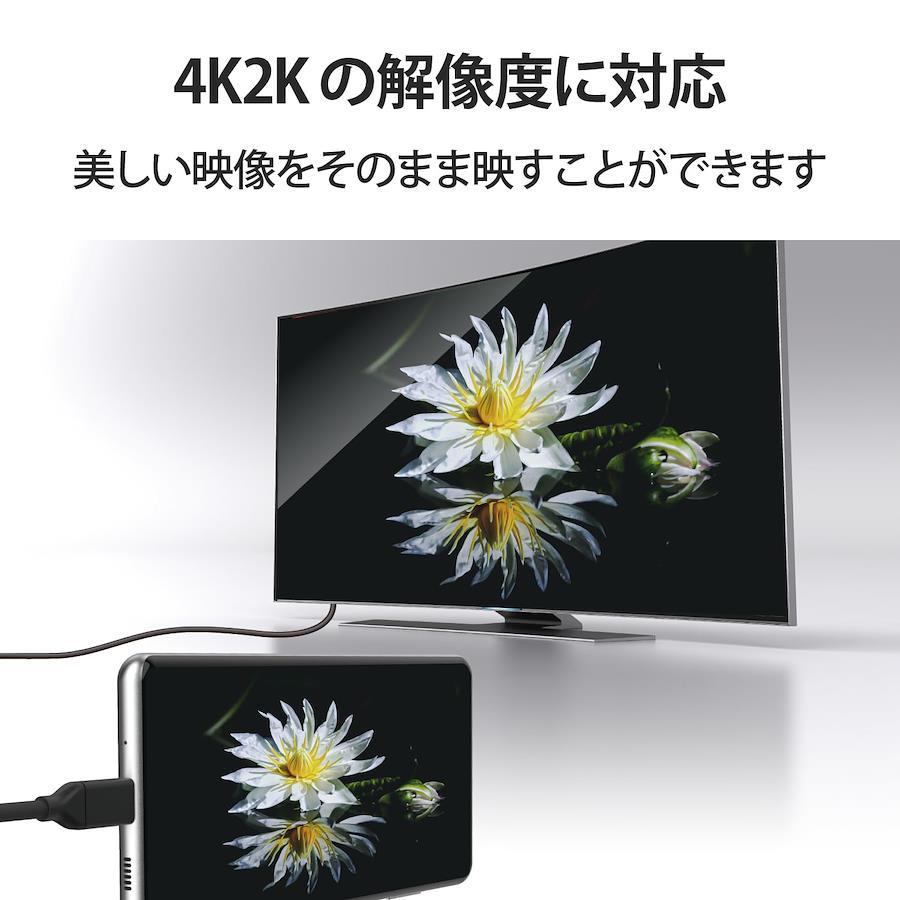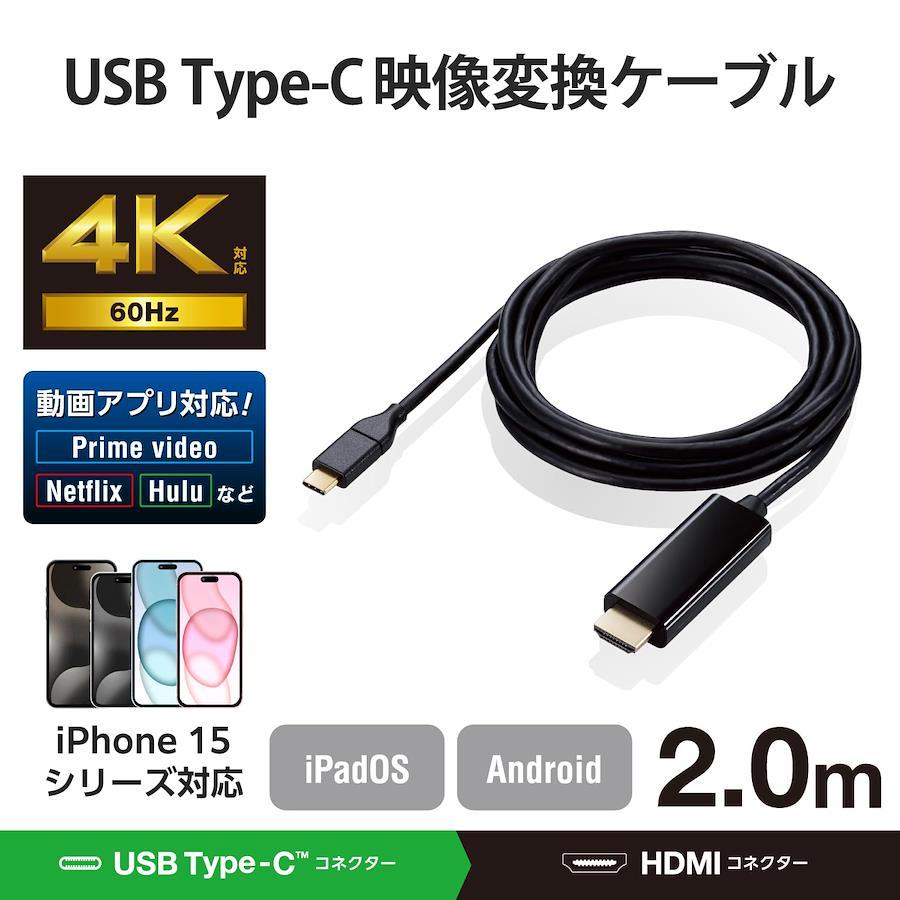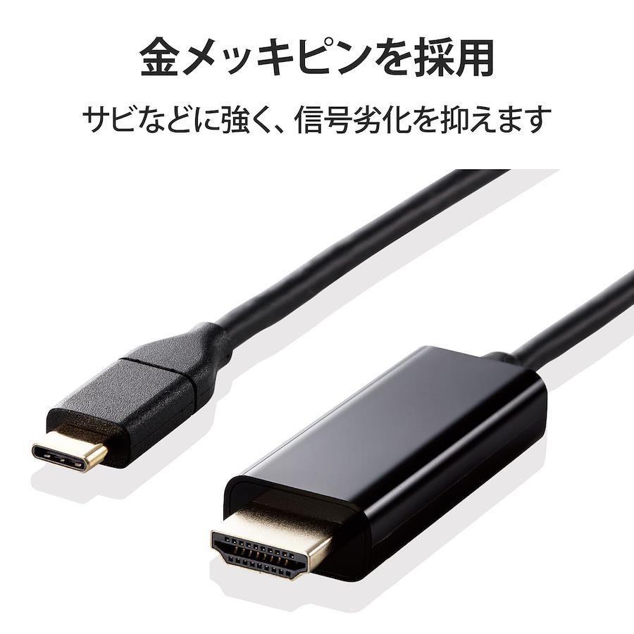 【 説明 】■USB Type-C(TM)端子搭載PC、スマホ、タブレットなどの映像信号を変換し、HDMI入力端子を搭載したディスプレイなどに出力することができるUSB Type-C(TM)映像変換ケーブルです。※ HDMIからUSB Type-C(TM)への変換はできません。※ 音声出力に対応しています。※ 映像が正しく表示されない場合は、接続先のディスプレイの電源ON/OFFや各接続コネクターの抜き差しをお試し下さい。※ 環境、機器により正常に動作しない場合があります。※ 本製品で映像出力を行う際は、出力機器がDisplayPort Alt Mode対応であることをご確認ください。■追加したディスプレイを一つの画面として表示するマルチディスプレイと、1台目のディスプレイと同じ画面を表示するミラーリングに対応しています。※ スマホ、タブレットはマルチディスプレイにご利用いただけません。■著作権保護技術のHDCP1.4/HDCP2.2に対応しています。■ドライバーは不要で、本製品1本で高画質映像と音声を伝送できます。■HDMIケーブルを追加で準備する必要がなく、