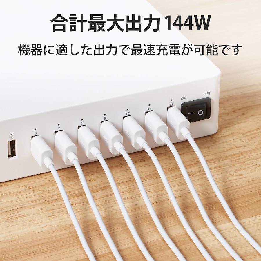 【 説明 】■ 最大12台までのスマートフォンやタブレットのほか、さまざまなUSB機器をこれ一つで同時に急速充電できるAC充電器です。■ 1ポート最大出力12W(5V/2.4A)、合計最大出力144W(5V/28.8A)の高出力タイプです。■ USBポートに搭載した高性能ICがiPhoneとAndroid端末を自動で見分けて、最適な出力で充電できる“おまかせ充電”に対応しています。■ 別途ACアダプタが不要な、一体型設計を採用しています。■ 充電をまとめてオン・オフできる、集中電源スイッチを前面に搭載しています。■ ポートごとに、充電状態が確認できる動作確認LEDを搭載しています。※充電する端末により動作が異なります。 端末によっては充電完了してもLEDが変化しない場合があります。■ 木製のキャビネットやラック、机などに固定できる、L字プレート(2枚)、プレート取り付け用ネジ(8個)、固定用ネジ(8個)を付属しています。■ ケーブルの固定に使える、ケーブル固定用バンド(1点)を付属しています。