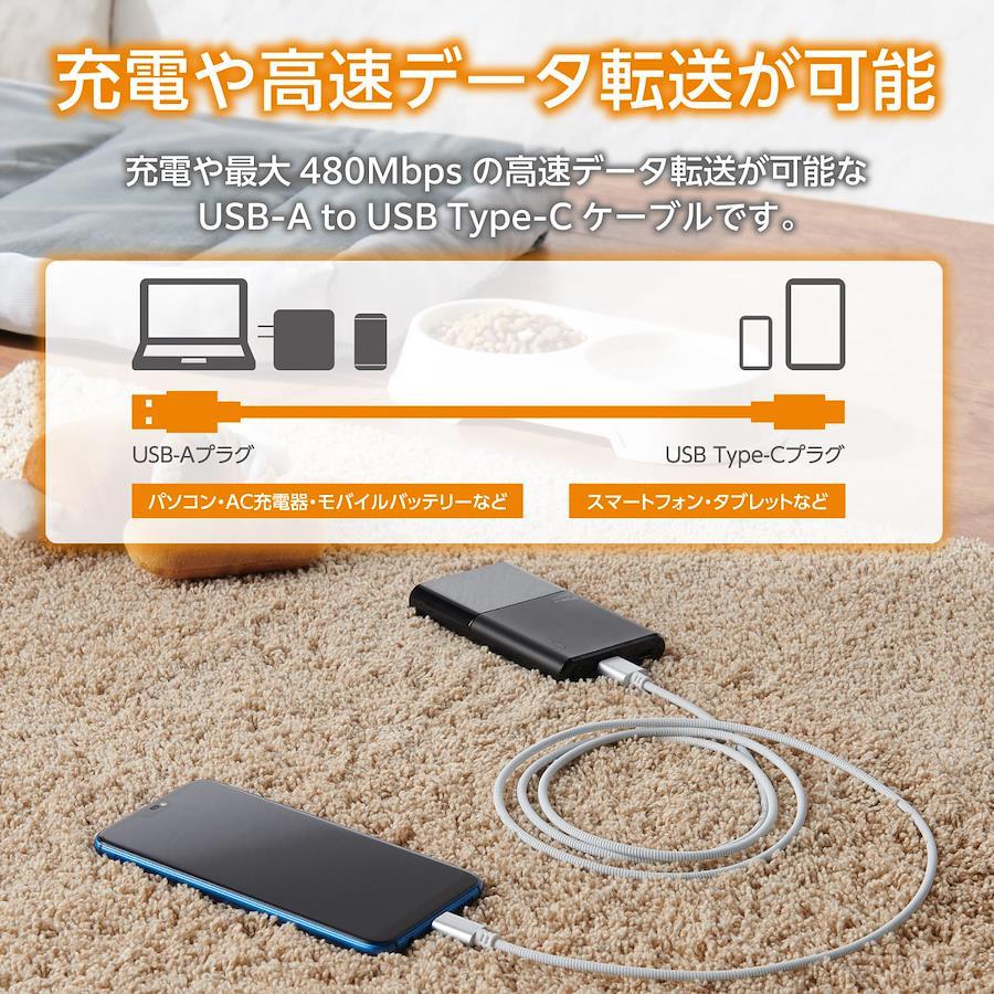 USB-Aポート搭載のパソコンやAC充電器などとUSB Type-Cポート搭載のスマートフォンやタブレットを接続し、充電や最大480Mbpsの高速データ転送が可能です。 ※理論値
