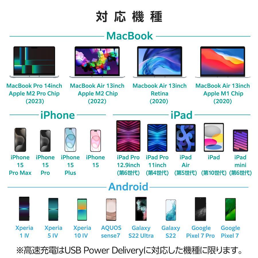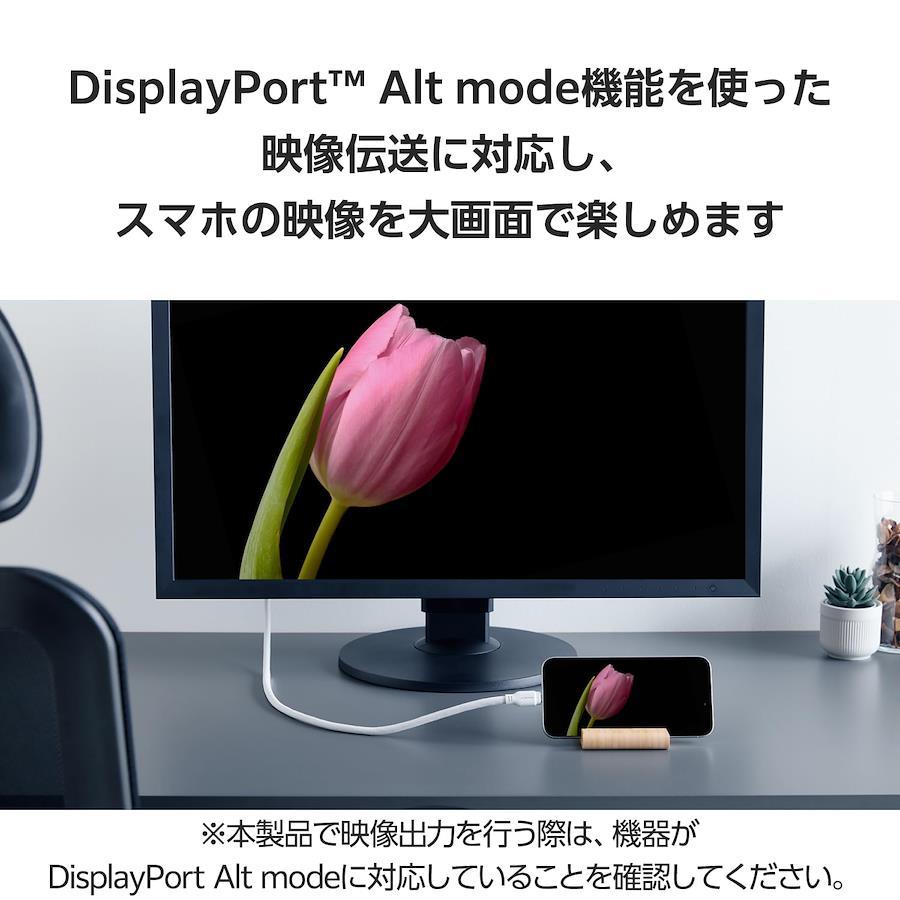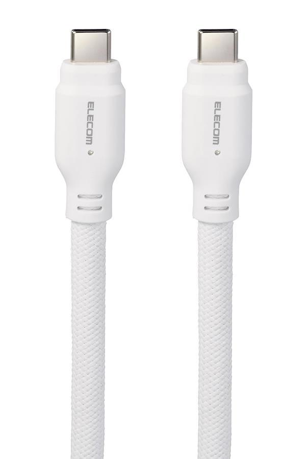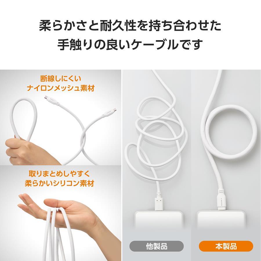 USB Type-C(TM)ポート搭載のスマートフォンやタブレットなどに、USB Type-Cポート搭載のパソコンおよびAC充電器・モバイルバッテリーなどを接続し、充電やデータ転送ができるUSB Type-Cケーブルです。やわらかく断線しにくいシリコンメッシュタイプ。シリコンケーブルの表面にメッシュ加工を施すことで、シリコン素材のやわらかさとナイロンメッシュの耐久性を持ち合わせた手触りの良いケーブルです。iPhone 15 ProシリーズをはじめとしたUSB 10Gbps(USB3.2(Gen2))仕様のスマートフォン・タブレットで、動画など大容量のデータを高速転送できます。スマートフォンで撮影した動画をパソコンで編集するために取り込む際などに便利です。USB Power Deliveryに対応しており、最大100W(20V/5A)で接続機器への給電が可能です。※接続する機器がUSB Power Delivery対応である必要があります。※ご使用になる機器の性能によって、供給される電流値が異なります。eMarker搭載のため、USB Power Delivery対応時の接続機器の適正電圧を自動調整。安定した充電が可能です。DisplayPort(TM) Alt mode機能を使った映像伝送に対応しています。スマートフォンで再生した映像を対応するディスプレイに映し、大画面で楽しめます。※本製品で映像出力を行う際は、機器がDisplayPort Alt modeに対応していることを確認してください。USB Type-C(TM)コネクターは、裏、表に関係なくケーブルを挿し込めます。
