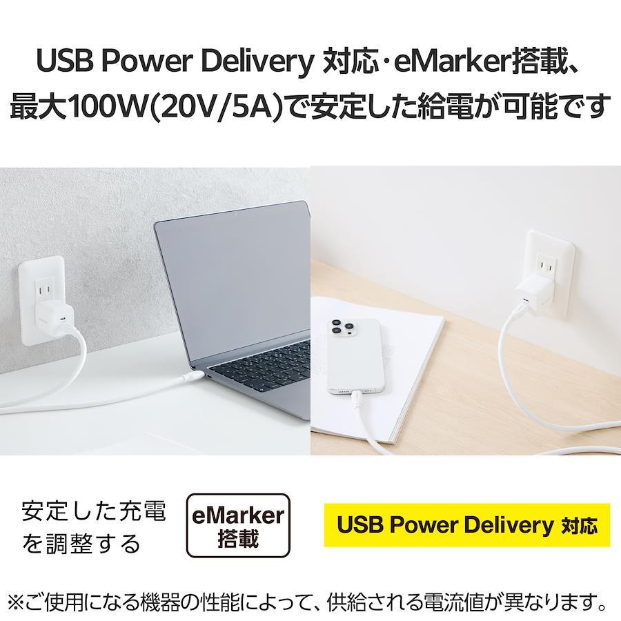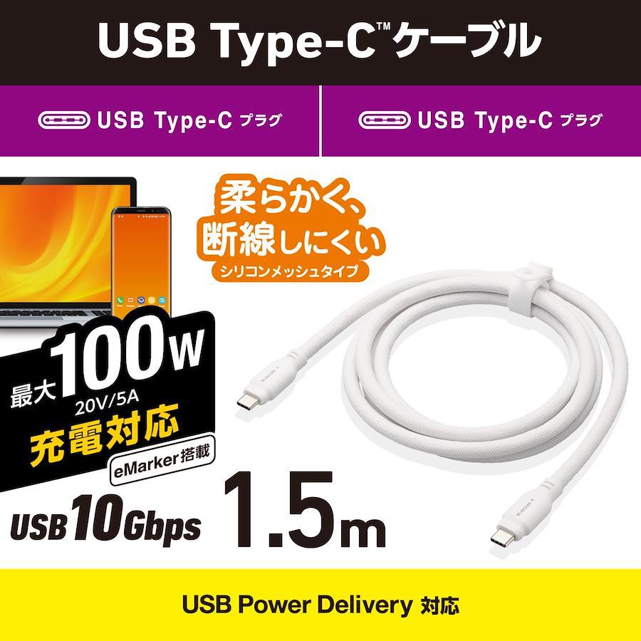 【 仕様 】■コネクター形状:USB Type-C(TM)プラグ - USB Type-C(TM)プラグ■対応機種:USB Type-C(TM)ポート搭載のスマートフォン、パソコン、AC充電器、モバイルバッテリーなど■ケーブル長:約1.5m ※コネクター含まず■ケーブル太さ:約6.8mm■規格:USB 10Gbps(USB3.2(Gen2))準拠■対応転送速度:最大10Gbps ※理論値■USB Power Delivery対応:○■対応ワット数:最大100W■ALTモード対応:○■プラグメッキ仕様:金メッキピン■シールド方法:2重シールド■ツイストペアケーブル(通信線):○■付属品:ケーブルバンド■カラー:ホワイト■保証期間:1年間■環境配慮事項:EU RoHS指令準拠、THINK ECOLOGYマーク■パッケージ形態:袋+ステッカー