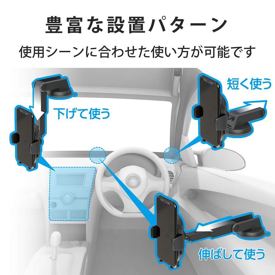 ■ ホルダー仕様:ゲル吸盤貼り付け、ワンタッチ固定、ボールジョイントによる角度調整、角度伸縮自在ステー
