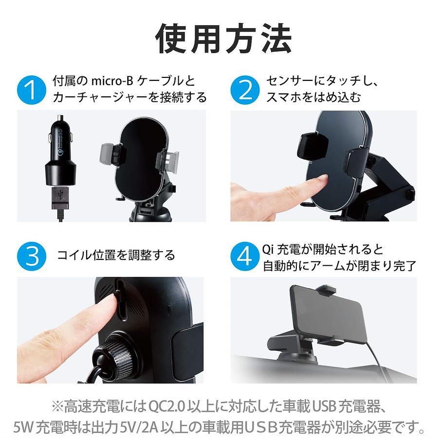 ■ その他:タッチセンサー搭載、Qi充電OFF機能、Qiコイル可動機能、出力5V/2A以上の車載用USB充電器が必要