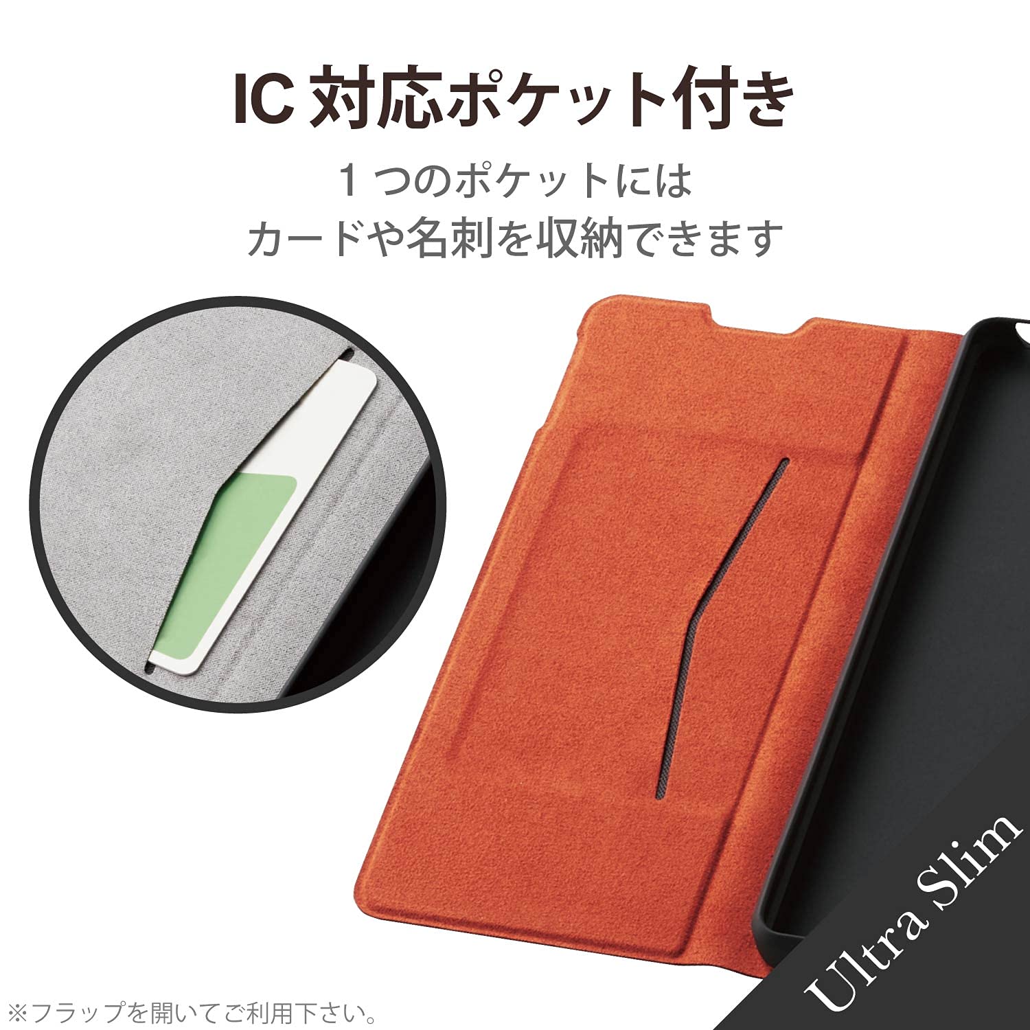 ■ カードを出し入れすることなく、そのままICカードを使用可能です。※フラップを開いてご使用ください。