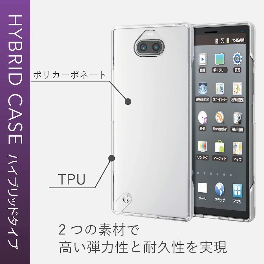 ■側面に弾力性のあるTPU素材を、背面に強じんで透明度の高いポリカーボネート素材を使用した、スリムなスタイルのXperia 8用ハイブリッドケースです。■側面は強じんな耐久性としなやかな弾力性を合わせ持ったTPU(熱可塑性ポリウレタン)素材のフレームが保護します。■背面は丈夫なポリカーボネート製のカバーが保護します。■四つ角にエアクッションを設け、本体を衝撃から守ります。■カバー背面と前面にそれぞれ凸型リブ設計を施し、背面カメラや背面、液晶画面のキズ付きを防ぎます。■ケースを装着したままで液晶画面の確認、本体の操作、充電・通信ケーブルの接続が可能です。■ストラップの取り付けができるストラップホールが付いています。※本製品にストラップは付属していません。