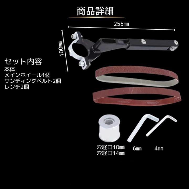 「商品仕様」サイズ : 約255x100mm (重量:約0.3kg) / 材質:ハイスピードスチール /付属品 : メインホイール1個、サンディングベルト2個、レンチ2個 *モニターの環境により、色の見え方に若干差が生じる場合がございます。