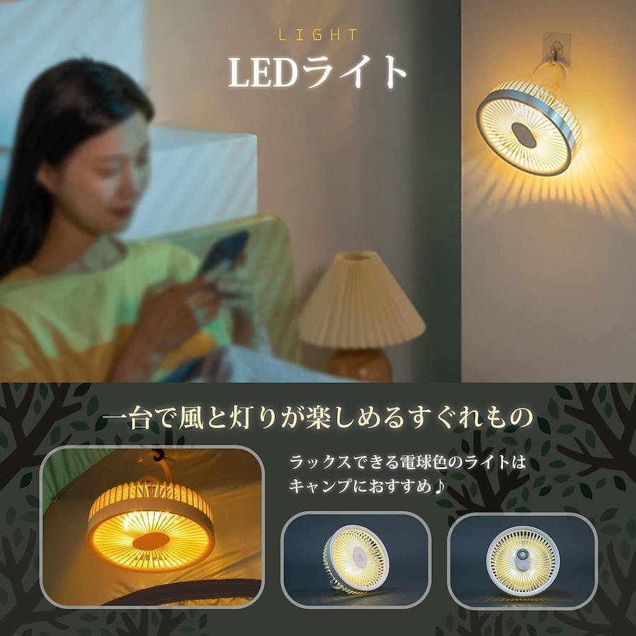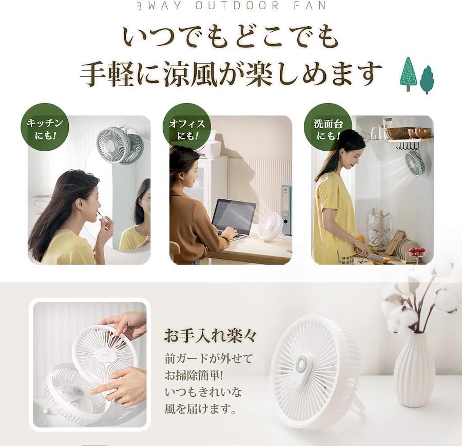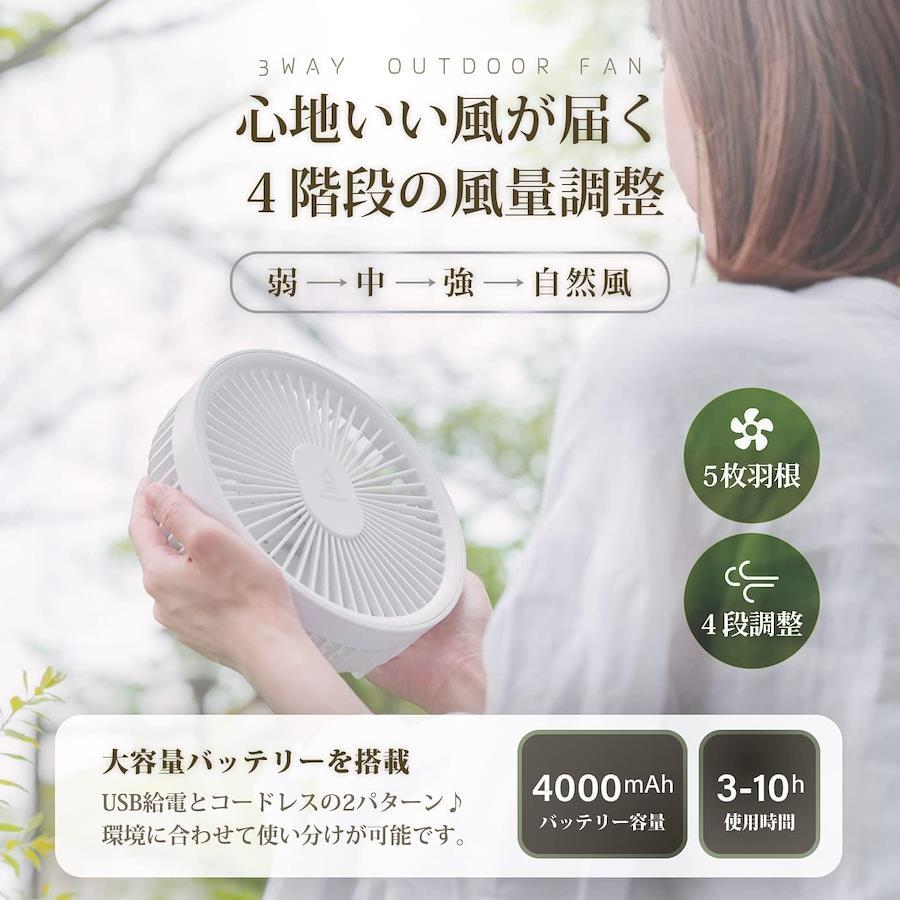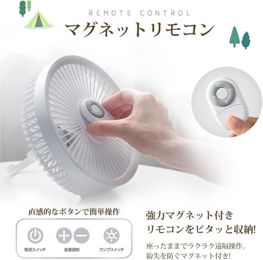 3営業日以内に発送≪新品未開封品≫:【2023年新型・1台3役 扇風機】 卓上・壁掛け・吊り下げの3Way ミニ扇風機です。コンパクトでシンプルなデザインはオフィスのデスクにもぴったり、洗面台にフックに引っ掛けるだけで壁掛け扇風機に早変わり、キッチンツールの掛け具などどこにも引っかかることが可能。さらに、テントやタープに吊り下げてシーリングファンとしてお使い頂けますので、あらゆる場所で活躍できます。【マグネット式 リモコン付き】マグネット式 リモコンが付いているので、遠隔操作が可能の上、リモコン本体は簡単に収納することが可能となり、紛失の心配が要りませんので、より一層頼もしい製品です。【5枚羽根・3段階風量調節】5枚羽根仕様なので、一般的な3枚羽根の 扇風機 と比べ、より穏やかな パワフル風量 を送ることが可能です。風量は3段階の切り替えが可能で、お好みの風量に合わせて、スイッチ1つで風量を自由にお選び、涼しい夏 をお楽しみます。【大容量 バッテリー・お手入れ簡単】4000mAhの大容量リチウム電池を搭載することにより、フル充電時で最大約10時間の連続動作が可能です。本体はABS樹脂を採用して、耐衝撃・耐久性に優れ