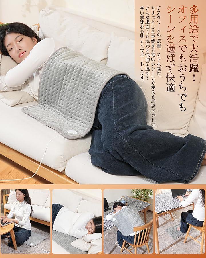 「一台多役&3分速暖。場所を選ばず全身ポカポカ」 電気足温器としての利用はもちろん、肩掛け/ひざ掛け/お腹の保温、さらには椅子に敷いてホット座布団としても使用可能な万能電気ホットマットです。