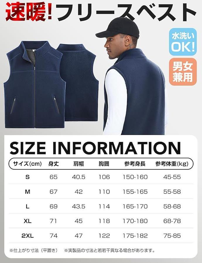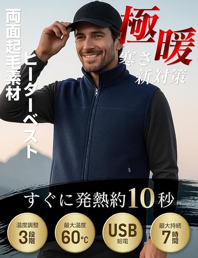 軽量で保温性に優れた両面起毛素材+6カ所ヒーターで、ふんわり暖かい電熱ベスト