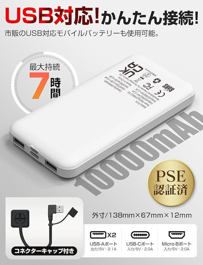 簡単使用。USB-Aコネクターに接続するだけでOK(市販の5V・2.1Aバッテリーも対応)
